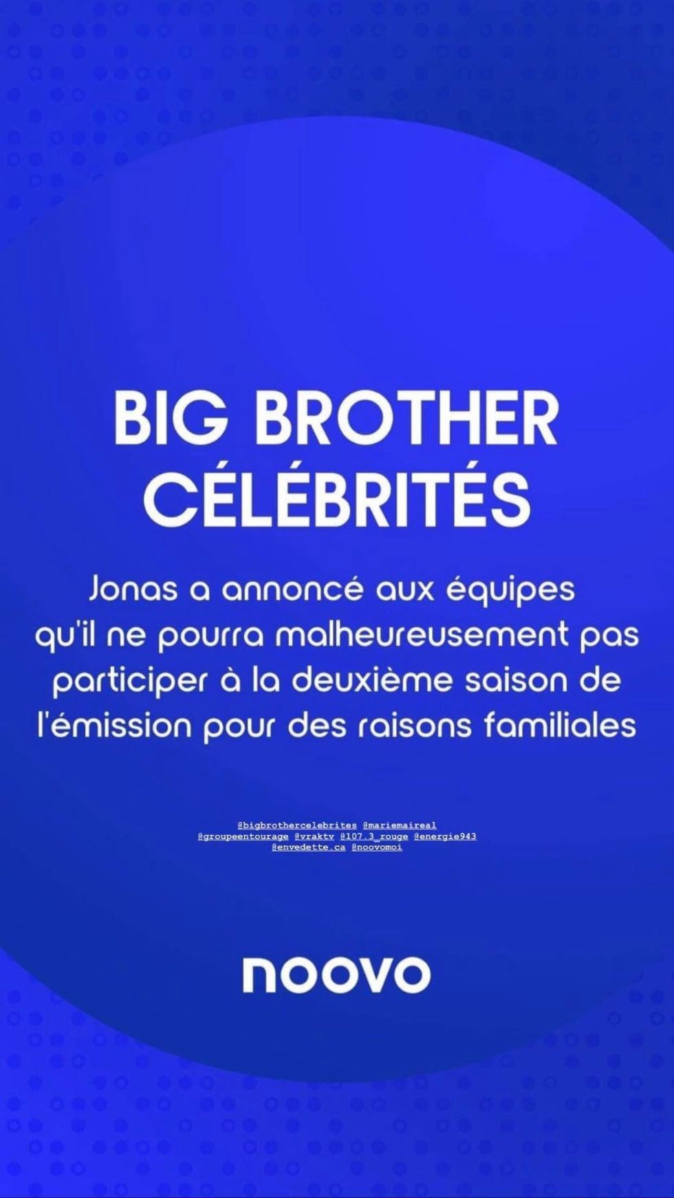 Cela dit, le 28 décembre, la plateforme de diffusion Noovo a annoncé via ses réseaux sociaux qu'en fait, Jonas ne sera pas de la nouvelle cuvée :