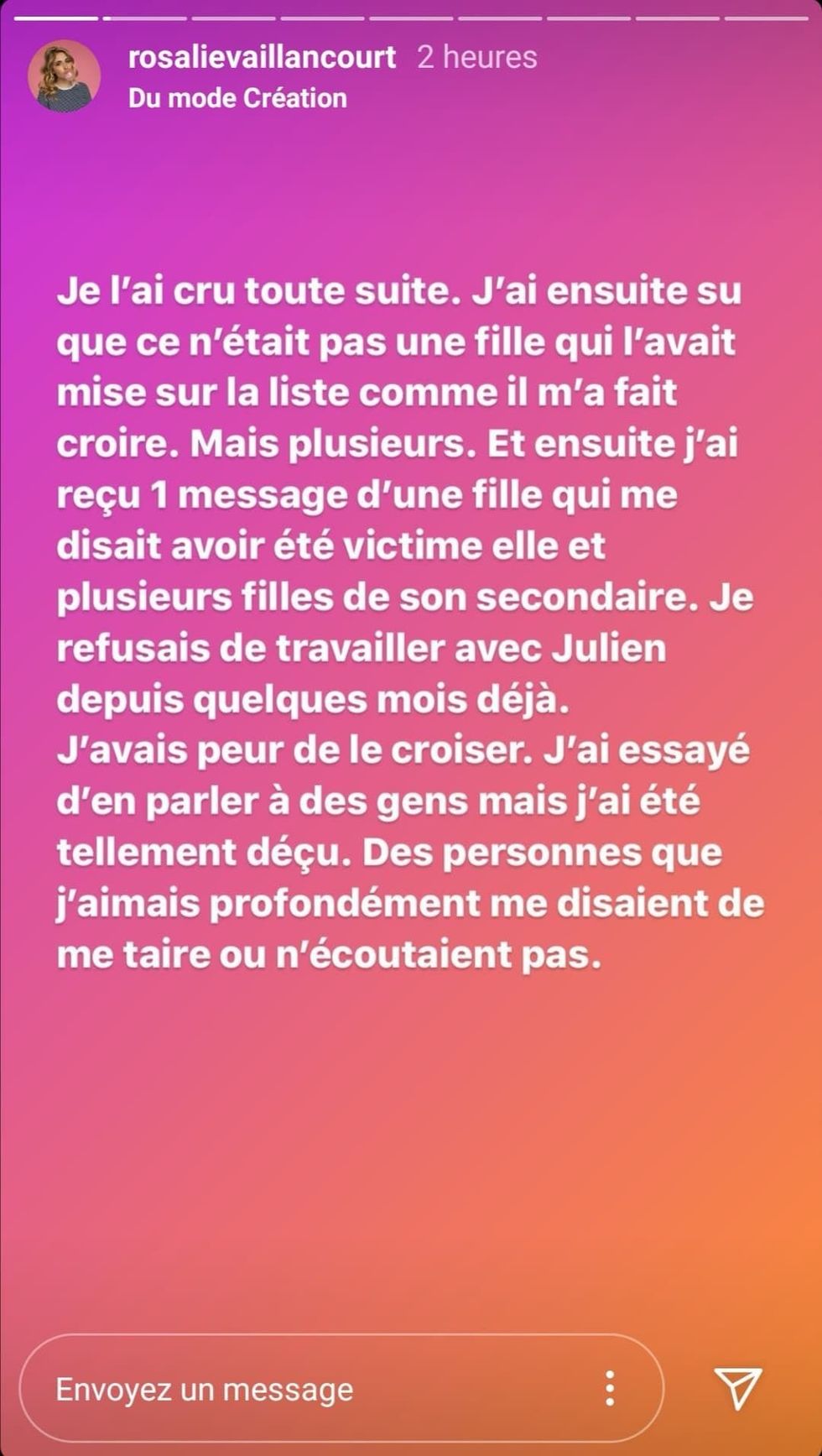 « Je souhaite de tout coeur que Julien va pour de vrai chercher de l'aide. Je sais que c'était ce que je devais faire. J'ai sûrement perdu des contrats ou des fans dans les derniers mois, semaines ou jours. Mais j'ai agi selon mes valeurs », confie Rosalie.