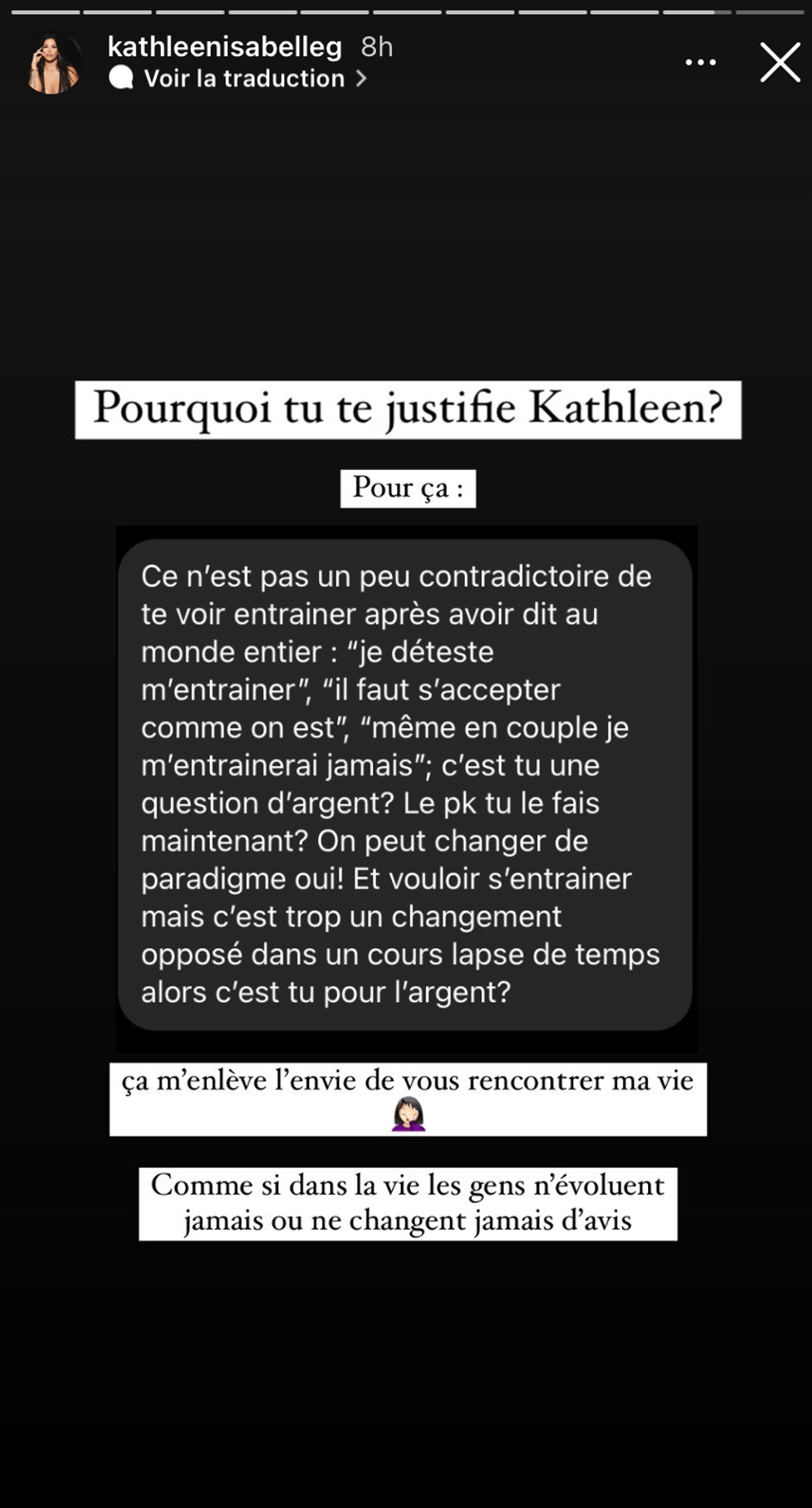 Kathleen a fini sa série de stories en montrant une capture d'écran du genre de commentaire qu'elle a reçu :