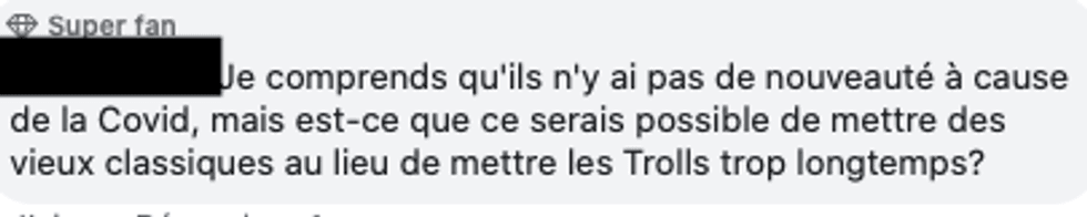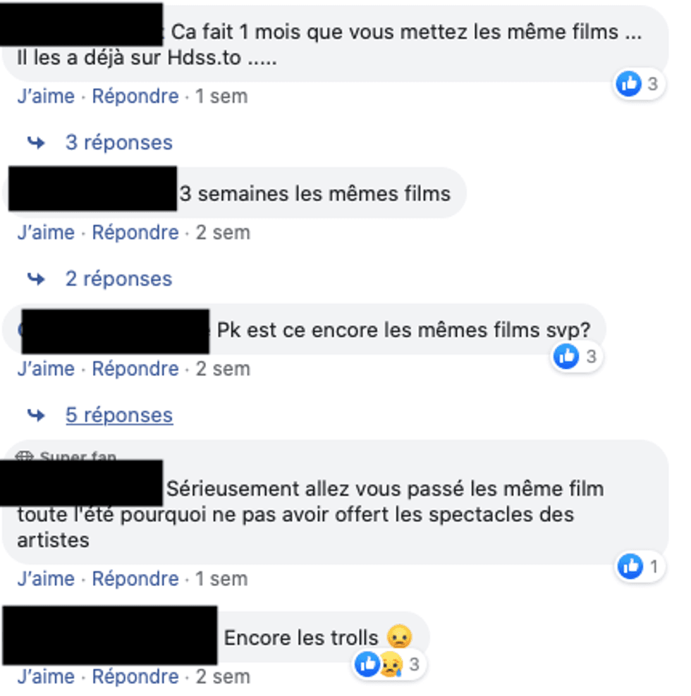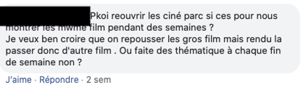 Pour d'autres, c'est plutôt le fait que la programmation se répète qui cause problème. Certains ciné-parcs ont en effet présenté les mêmes films plusieurs semaines de suite.