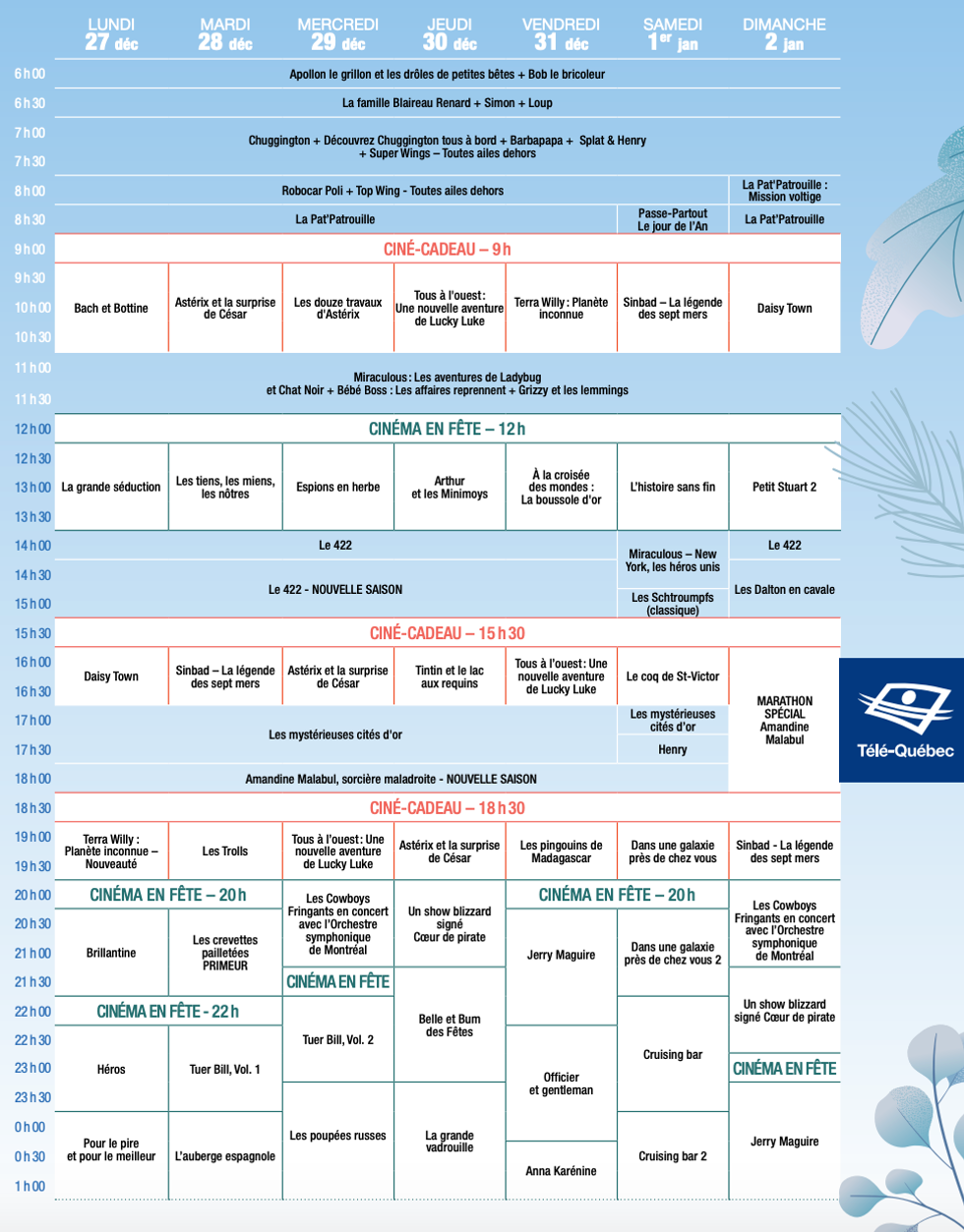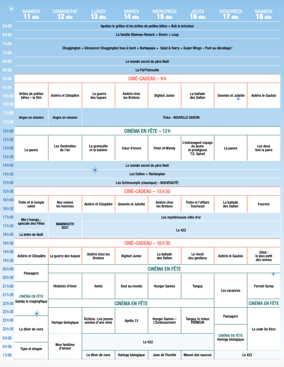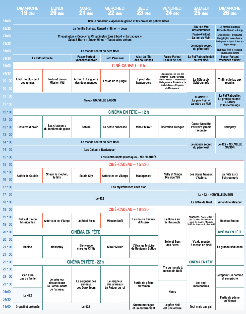 On retrouve sur l'horaire des classiques comme La guerre des tuques, Le monde secret du père Noël ainsi que Astérix et Cléopâtre, qui te rappelleront certainement les Noëls de ta jeunesse et sinon, ce seront des découvertes qui te plongeront dans la magie de la plus belle période de l'année.
