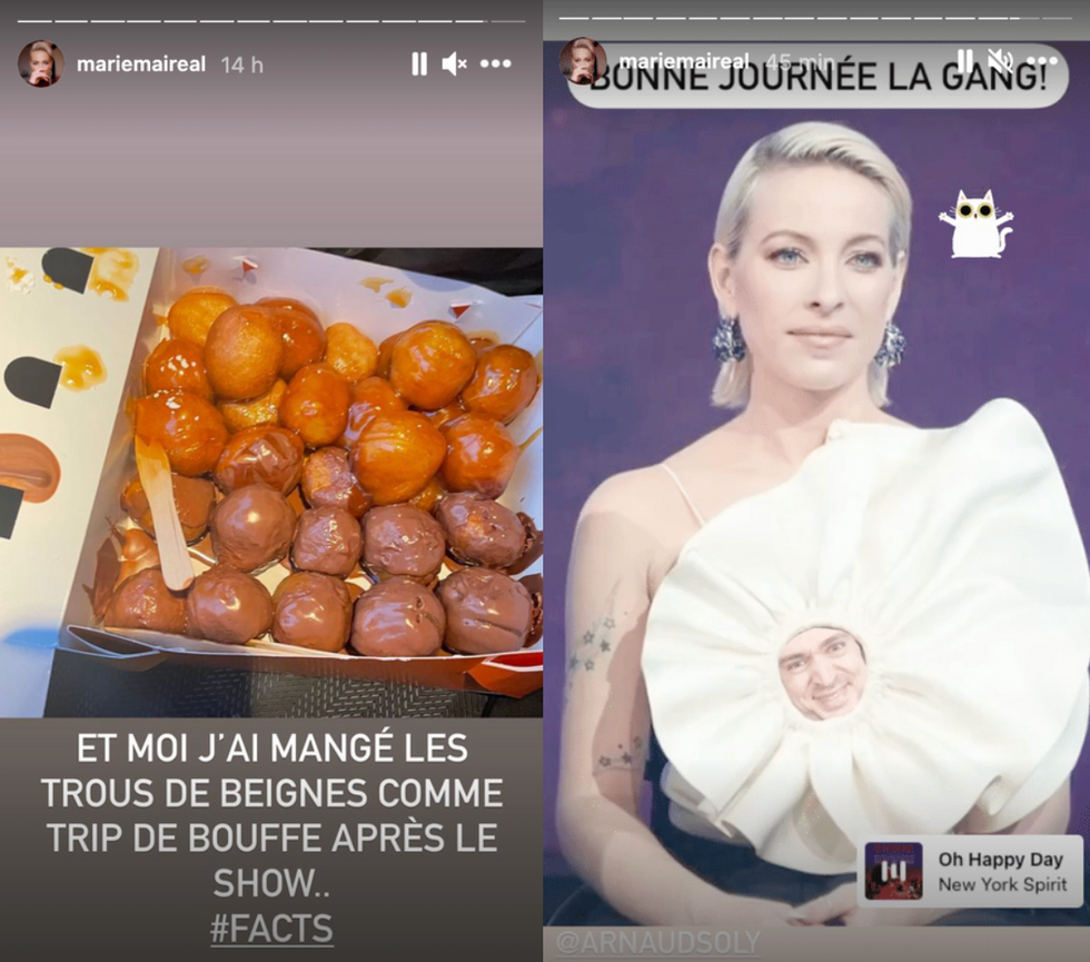 Sur son compte Instagram, elle a répondu à la photo de beignes d'Arnaud Soly en disant avoir « mangé les trous de beignes comme trip de bouffe après le show ».
