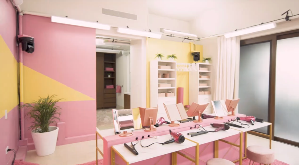 Cette jolie pièce toute rose et jaune est l'espace maquillage.