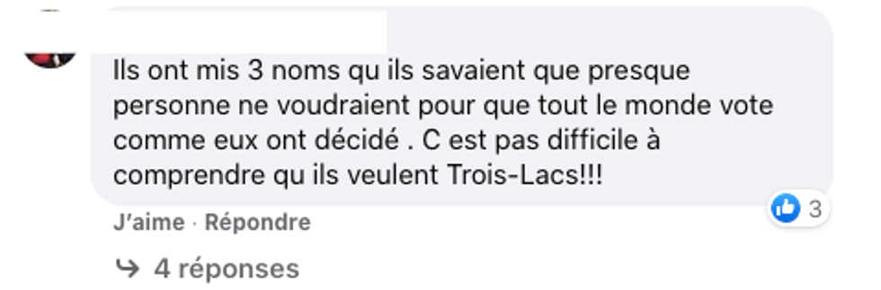Quelques commentaires expliquent aussi qu'ils ont l'impression que c'est un coup monté pour adopter le nom Trois-Lacs, qui fait référence à un lac dans un des quartiers.