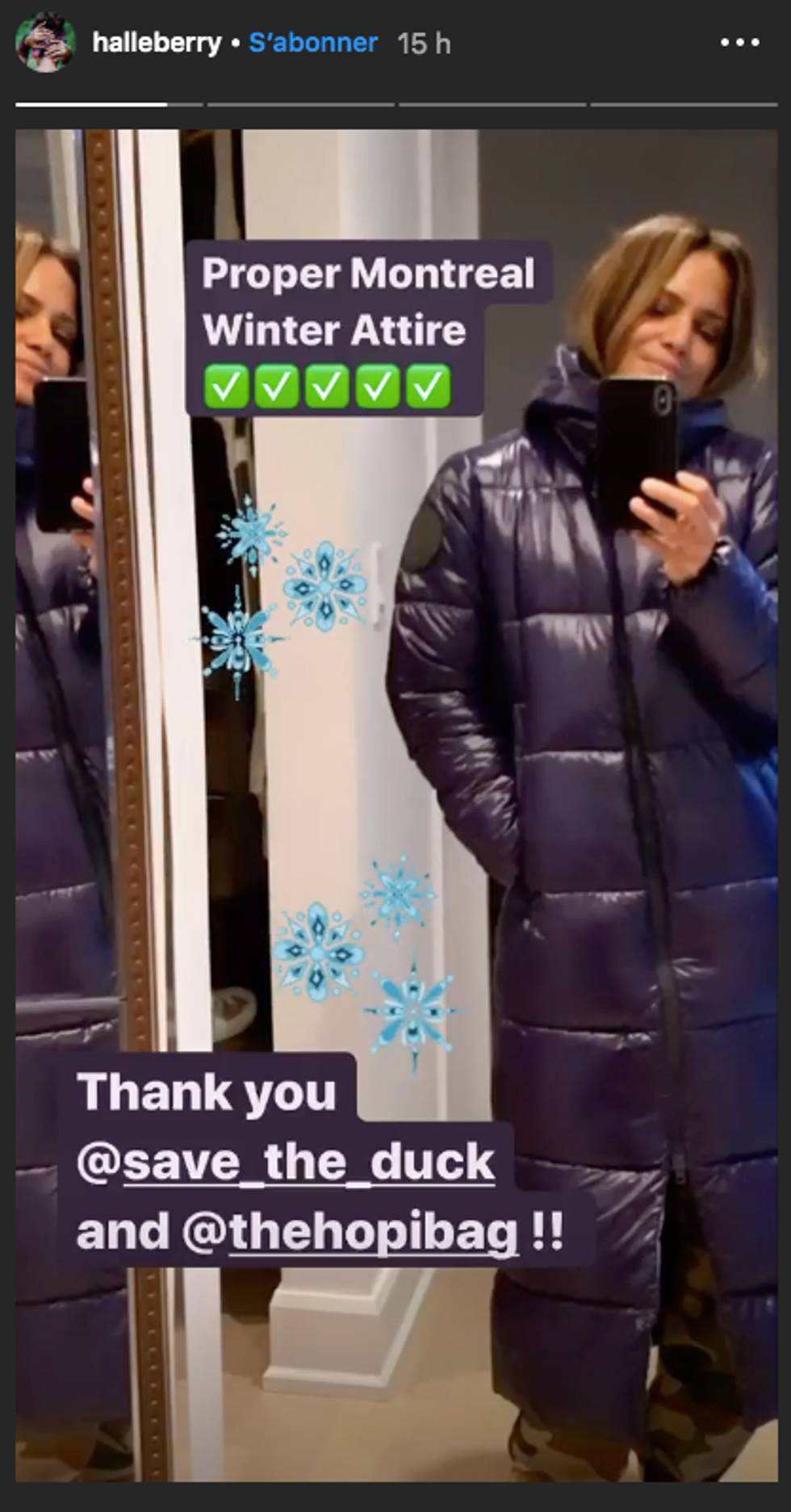 Depuis la mi-octobre, une actrice et mannequin américaine est à Montréal en vue du tournage du nouveau film Moonfall. On peut voir, dans sa story Instagram, qu'Halle Berry est prête pour l'hiver québécois.