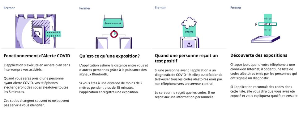 Grosso modo, l’application, qui est disponible en anglais et en français, permet aux usagers de recevoir une alerte s’ils ont des chances d'avoir été en contact avec une personne infectée utilisant elle aussi l’application.