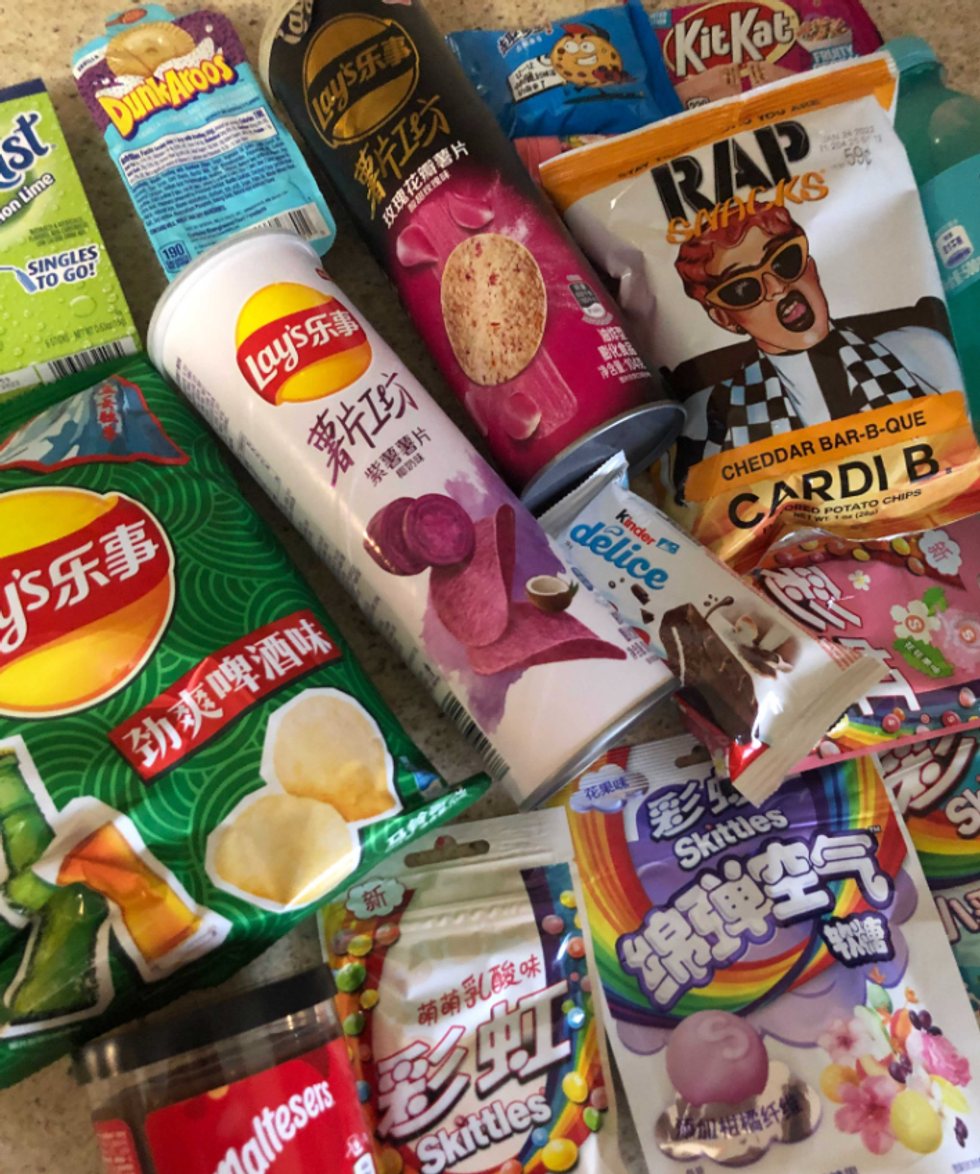 KitKat à saveur de Froot Loops (spoiler alert : juste miam!) , Skittles Gummies à saveur inconnue (bah oui, il n'y a rien en anglais ou en français sur l'emballage), chips à la bière, Lays aux pétales de roses, popcorn au chou vert...On retrouve de tous les goûts.