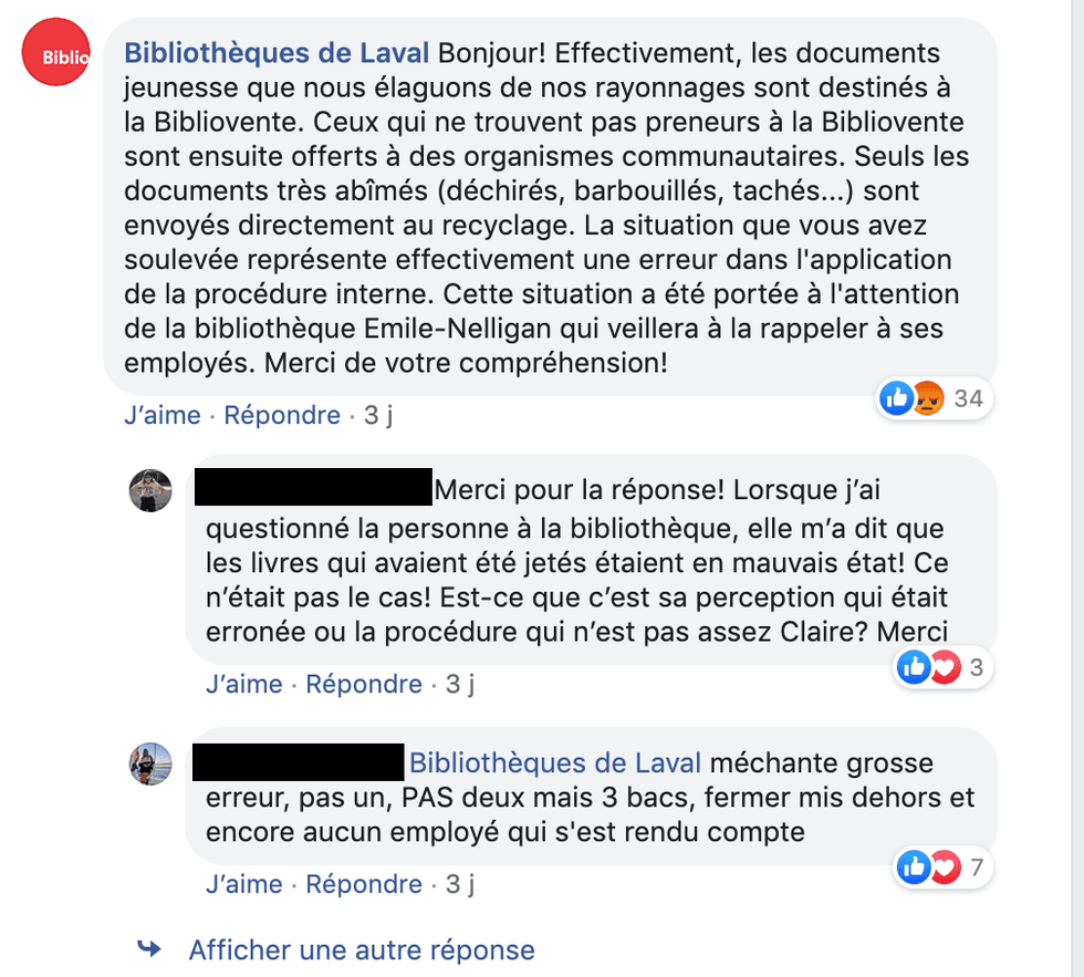 Questionnée sur le sujet, la page Facebook Bibliothèques de Laval affirme ne pas cautionner la situation et ajoute avoir contacté la bibliothèque Émile-Nelligan afin de rappeler la procédure à suivre à ses employés.
