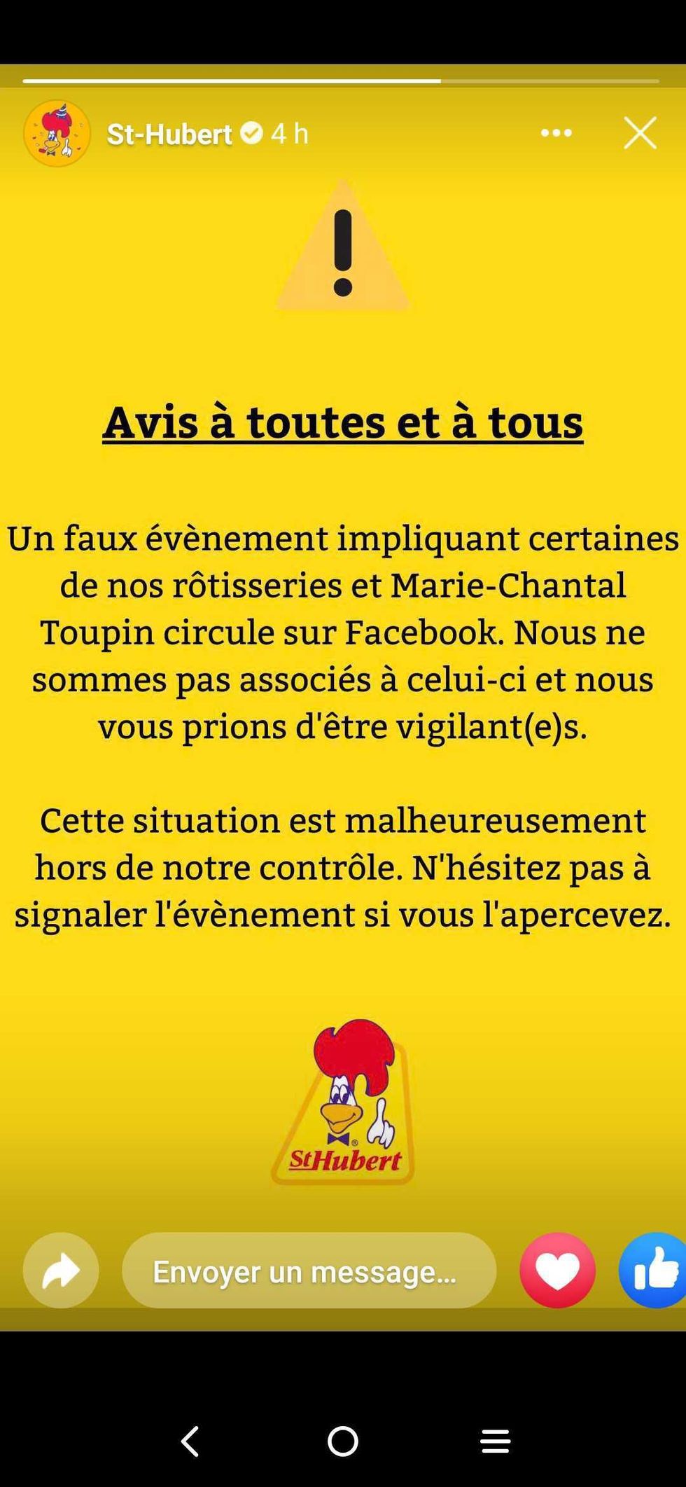 Bien que plusieurs indices dans le même genre laissaient croire à une blague et un faux événement, la chaîne de restauration St-Hubert a tenu à lancer un avertissement à ses client.es ce 13 octobre, via Facebook.