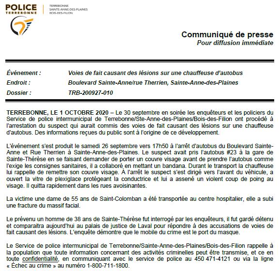 Depuis le 13 juillet 2020, le port du masque est obligatoire dans les transports collectifs, et ce, partout au Québec. Une chauffeuse d'autobus de Ste-Anne-des-Plaines a été blessée par un passager qui refusait de mettre son couvre-visage.
