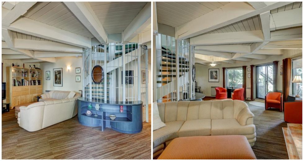 Un escalier en colimaçon représente l'élément central de la maison. Il se trouve au milieu de chacun des étages et sort du lot avec sa structure imposante.