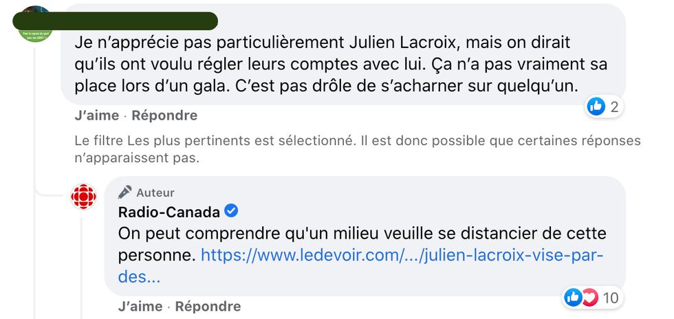Cela dit, sur la page Facebook de Radio-Canada, un commentaire mentionne avoir l'impression que les participants du gala s'acharnaient sur Julien Lacroix suite aux propos à son égard.