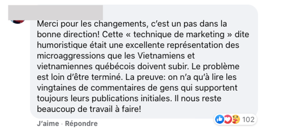 « Le Pho fait partie des traditions culinaires de ma famille qui a fuit le Vietnam des Viet Cong. Comme plusieurs, j’ai trouvé le menu du restaurant Pho King Bon vulgaire, sexiste et insultant. C’était un manque de respect envers la culture et la langue vietnamienne, et aussi, notre langue française!