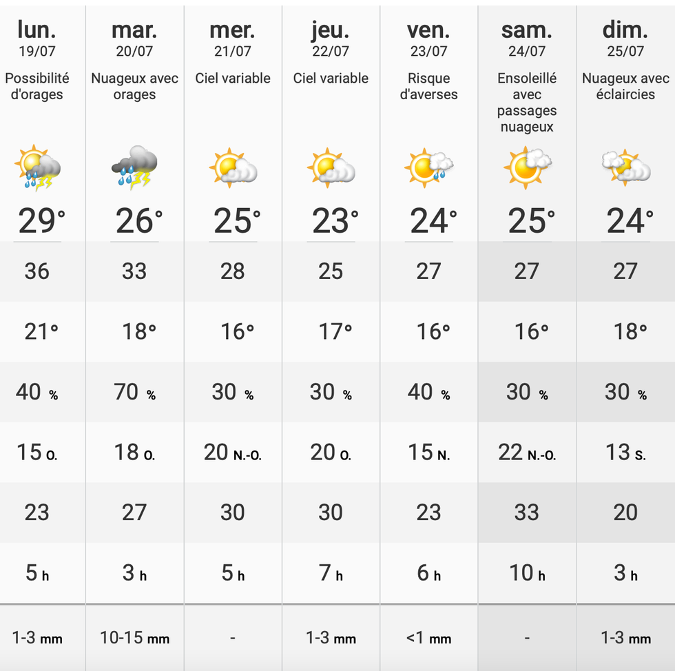 Toujours, selon la même source, il semble ne pas falloir espérer un retour de la canicule puisque les températures se stabiliseront en dessous de la normale de saison jusqu'à la fin du mois de juillet.