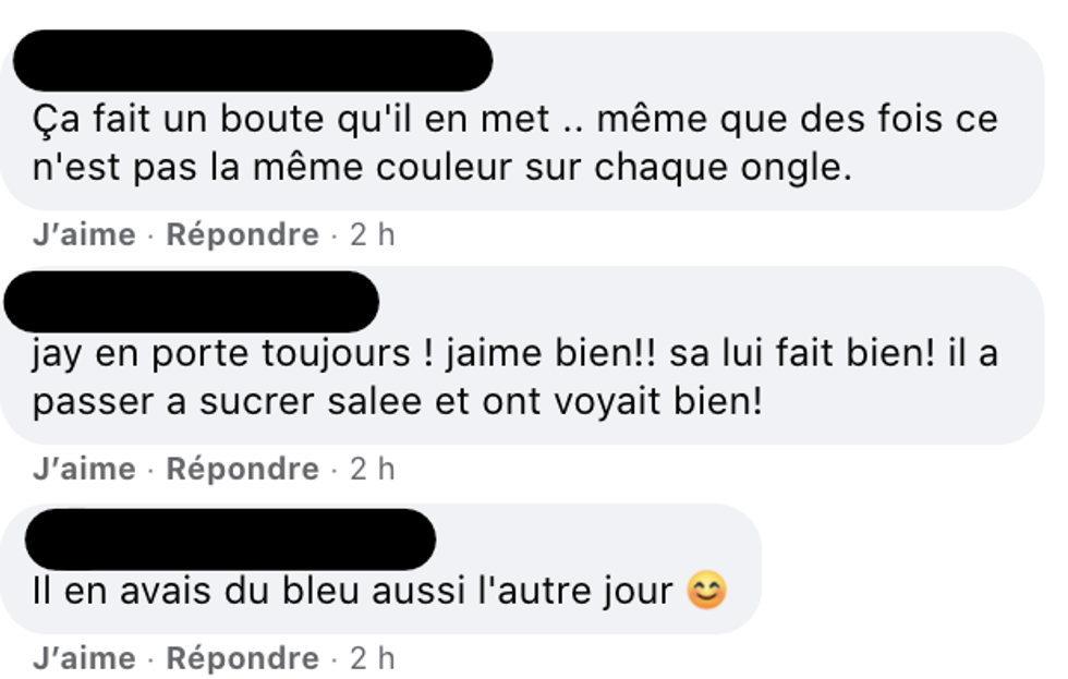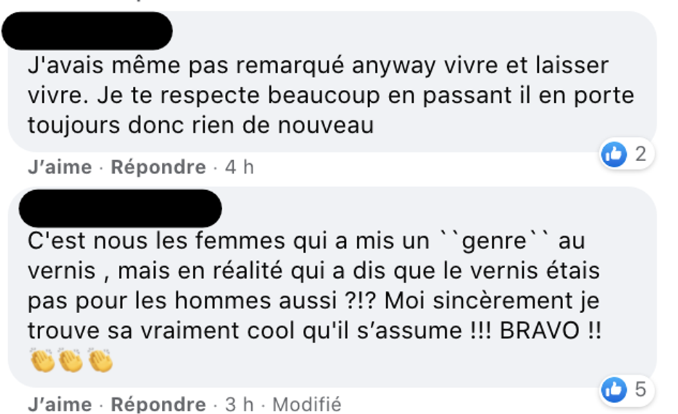 Cela dit, selon lui, le fait de porter du « Cutex » lui a aussi permis d’avoir un impact positif, alors que des mères lui écrivent pour partager le fait que leurs fils se sentent plus confiants avec leur vernis en ayant un humoriste et animateur connu comme exemple.