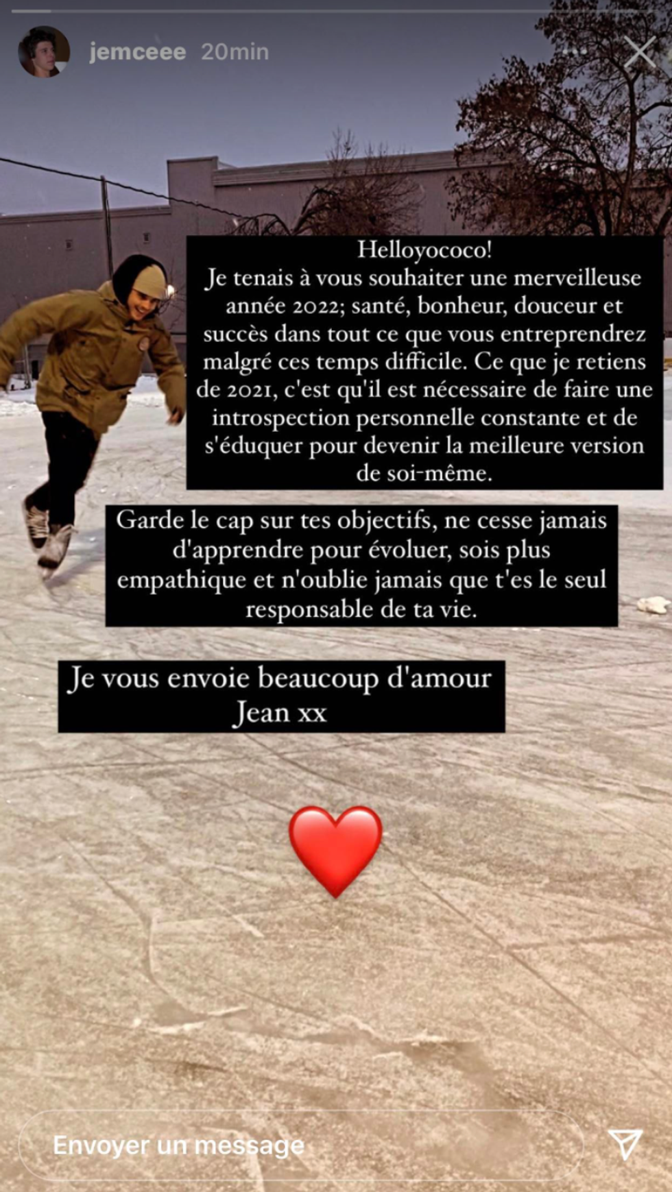 Plus tard dans l'année, le 13 janvier, Jemcee a recommencé à publier des images de son quotidien, alors qu'il a simplement partagé deux vidéos de sa journée en snowboard.