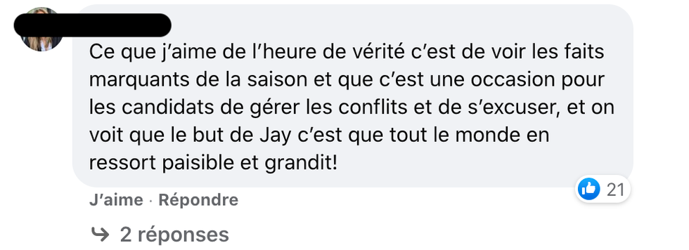 On souligne aussi le travail de l'animateur Jay Du Temple, qui permettrait aux candidat.es de terminer l'aventure sur une note paisible.