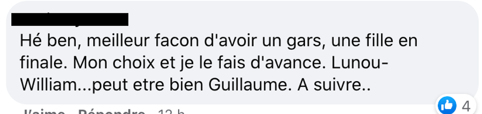 « Miracle, la prod a pris une décision équitable en faisant des demies finales F/G ; pas de manipulation des éliminations ainsi. »