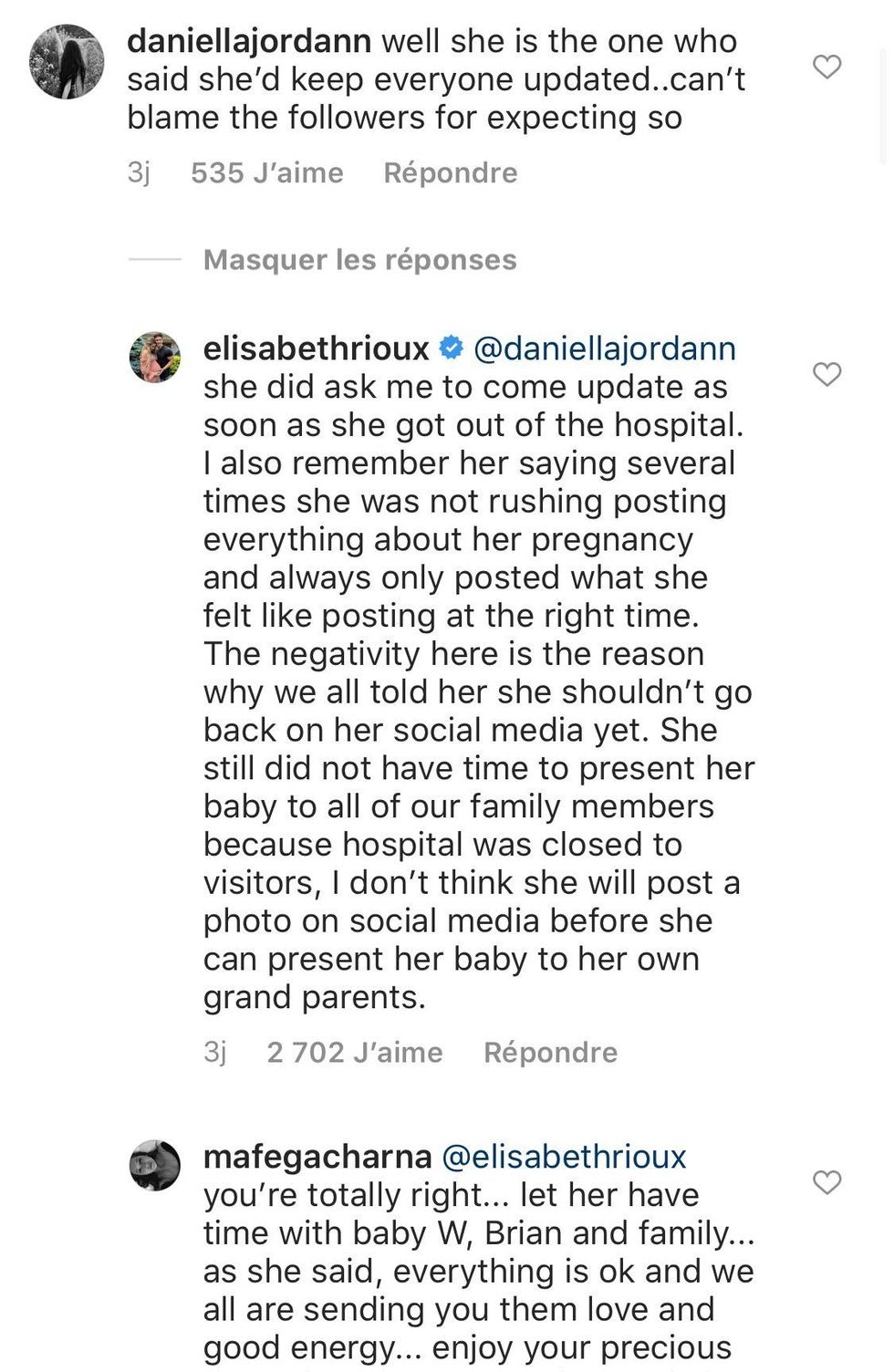 À travers une autre réponse offerte par le compte officiel d'Élisabeth, on comprend que la jeune femme n'a pas encore eu l'occasion de présenter le nouveau-né à sa famille compte tenu de la situation actuelle et qu'elle souhaite le faire en bonne et due forme.