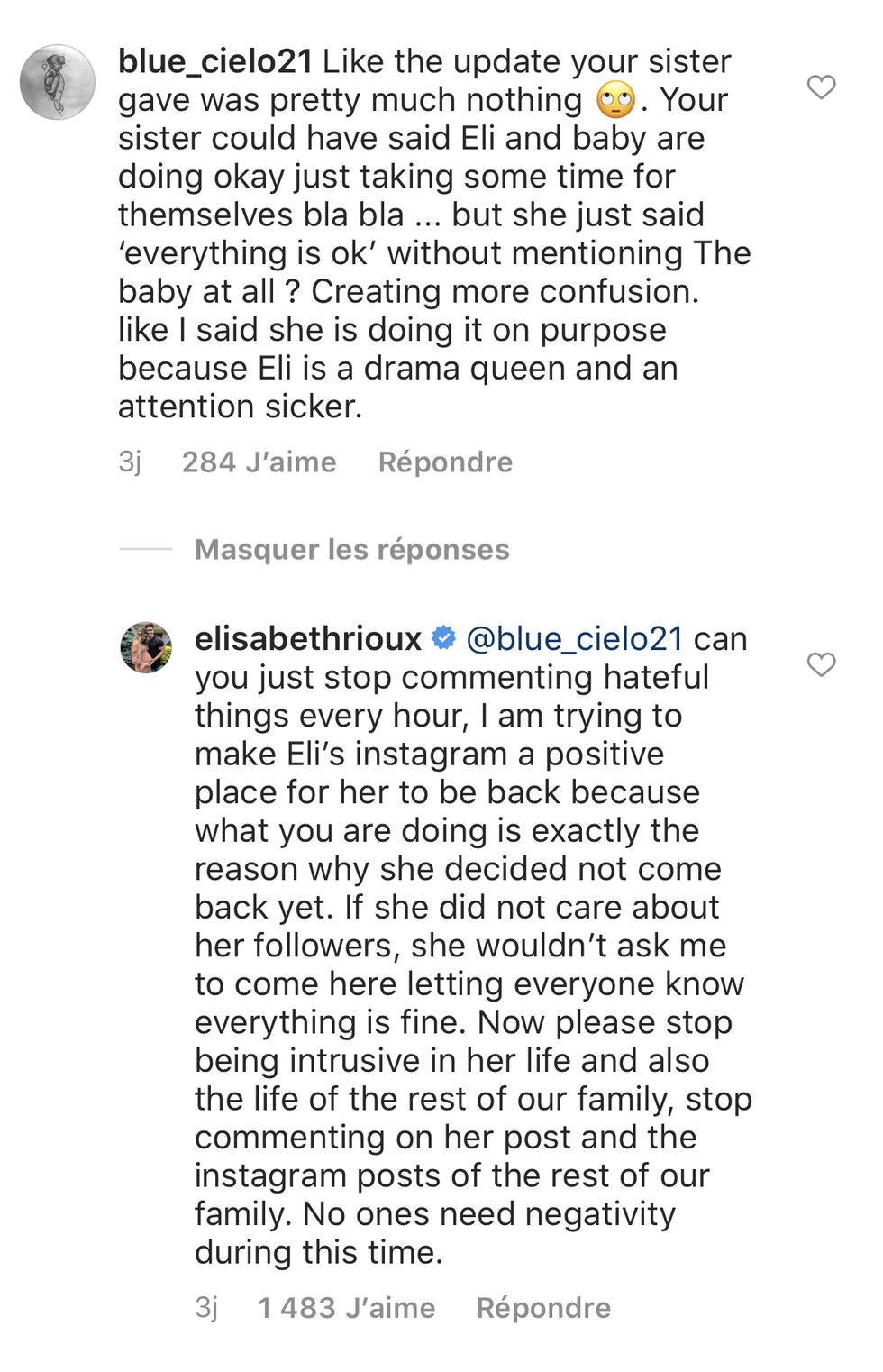 « Les mises à jour que ta sœur a données ne valent pratiquement rien. Ta sœur aurait pu dire : "Éli et le bébé vont bien, ils prennent seulement du temps pour eux", mais elle a simplement dit "tout va bien" sans mentionner le bébé du tout? Ça crée encore plus de confusion. Comme je l'ai dit, elle le fait exprès, car Éli est une reine du drame et adore l'attention. »