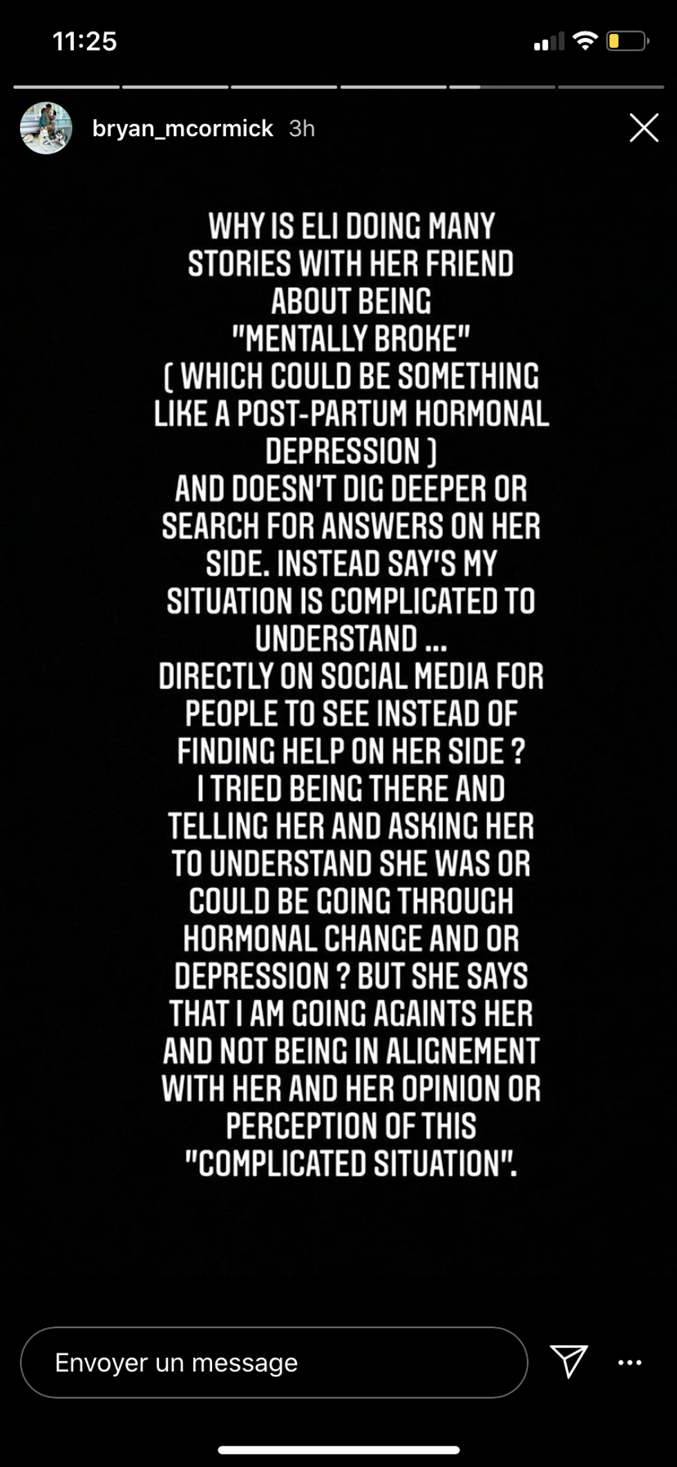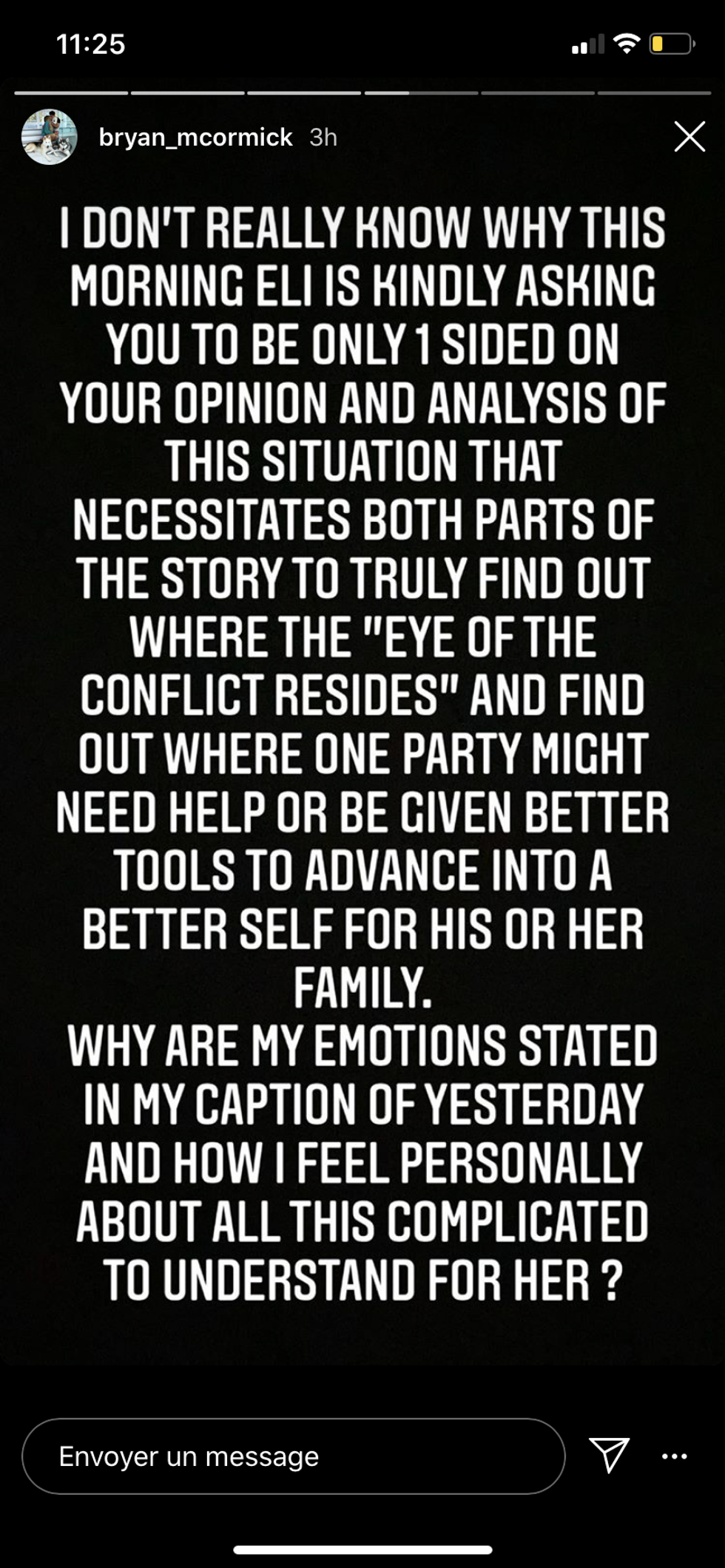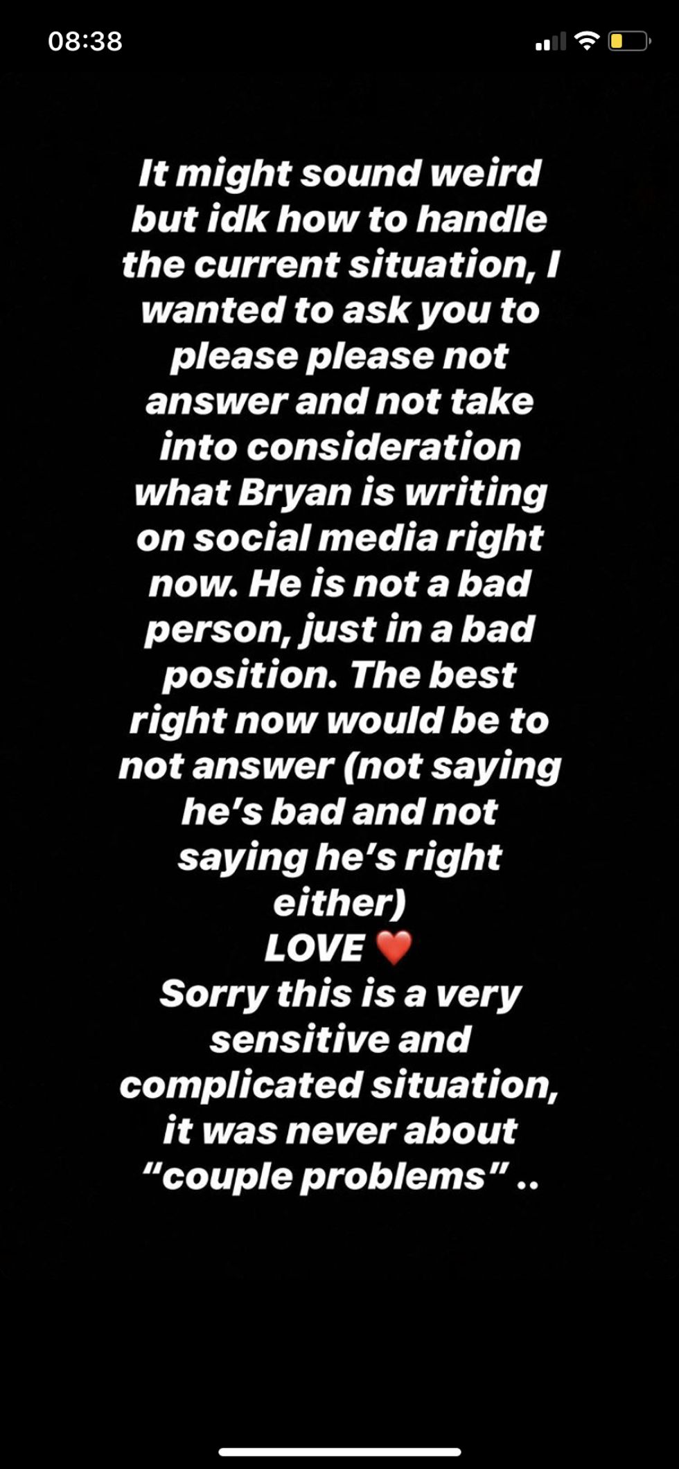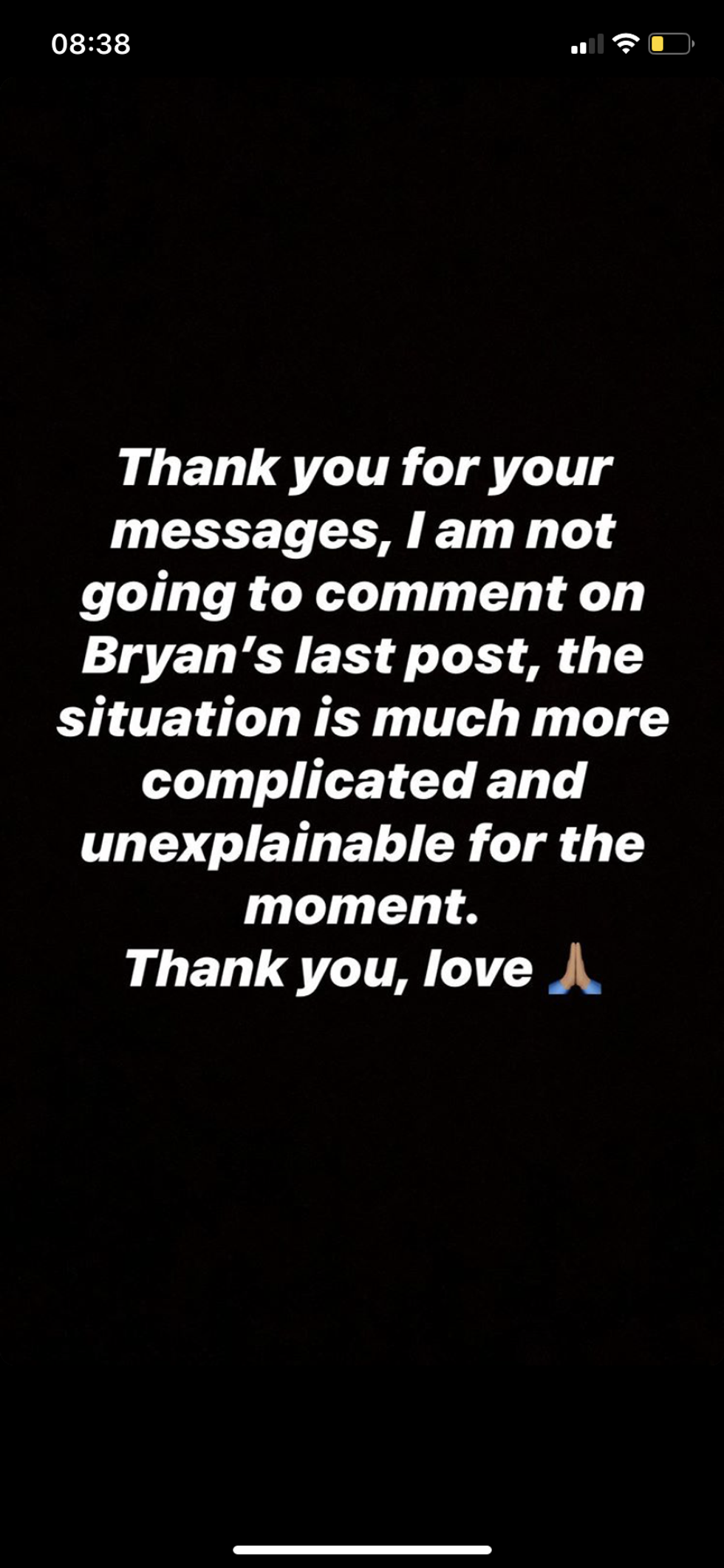 Dans une autre story Instagram, elle avoue ne pas savoir comment gérer la situation, mais demande de ne pas « prendre en considération ce que Bryan écrit sur les réseaux sociaux en ce moment ».