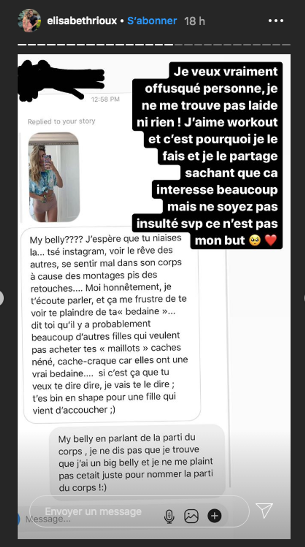 « Moi, honnêtement, je t’écoute parler, et ça me frustre de te voir te plaindre de ta “bedaine”… dit toi qu’il y a probablement beaucoup d’autres filles qui veulent pas acheter tes “maillots” caches néné, cache-craque, car elles ont une vrai bedaine. »
