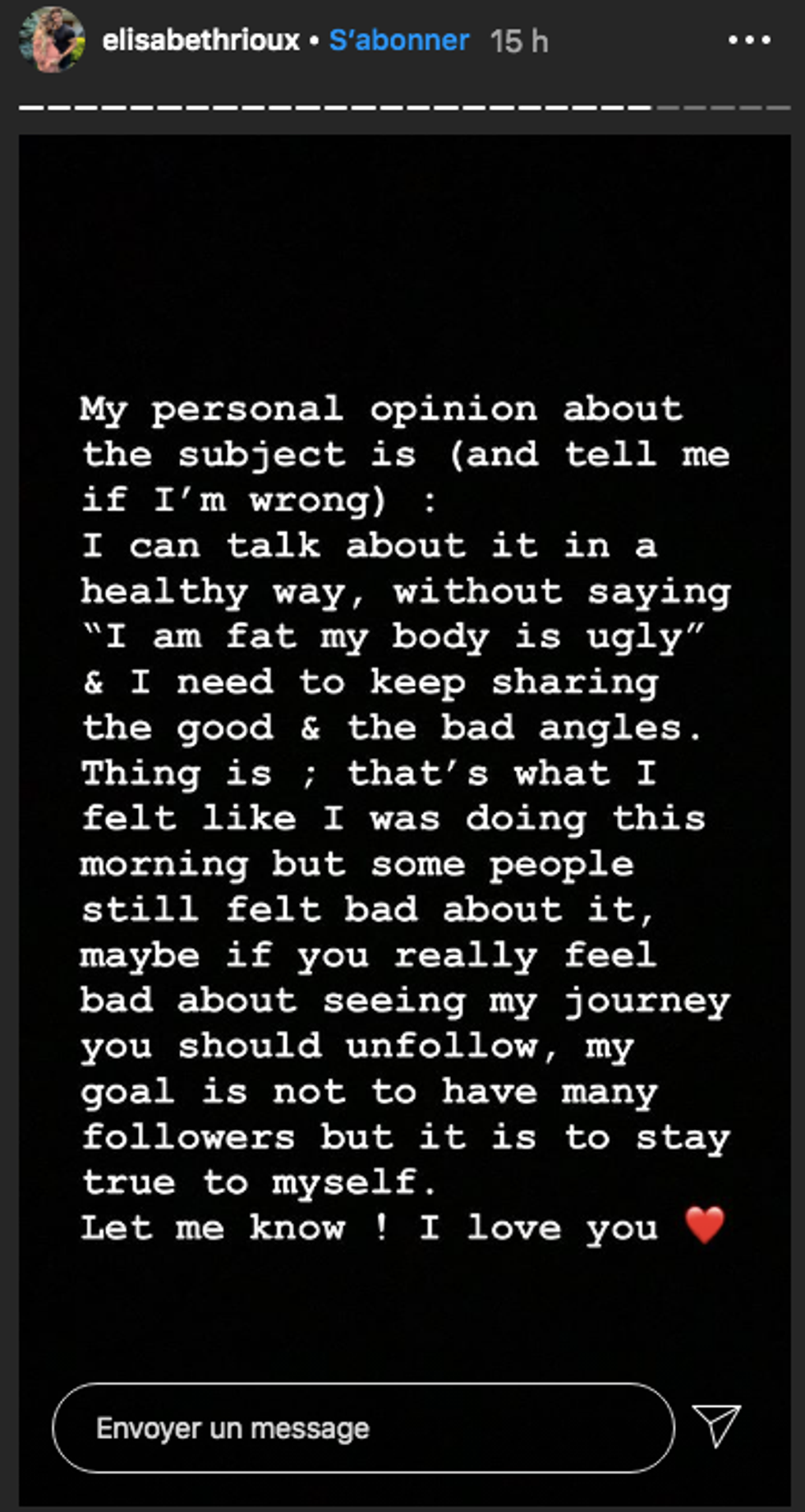 « Mon opinion personnelle sur le sujet est (et dites-moi si je me trompe) : Je peux en parler de manière saine, sans dire “je suis grosse, mon corps est laid” et je dois continuer de partager les bons comme les mauvais angles.