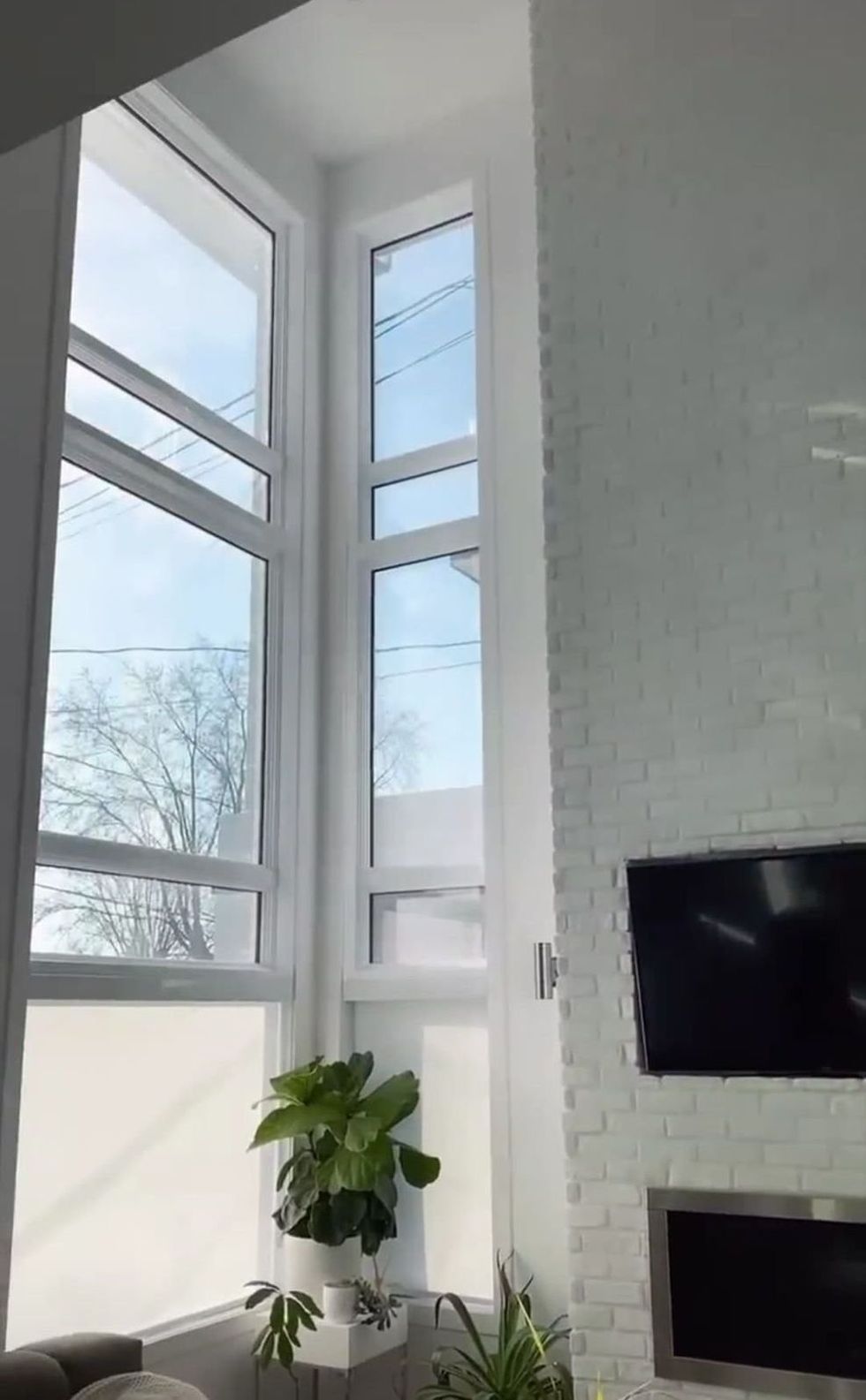 Dans le salon, on retrouve un impressionnant foyer en brique blanche avec une télévision juste au-dessus. Un large divan en « L » remplit le reste de la pièce.