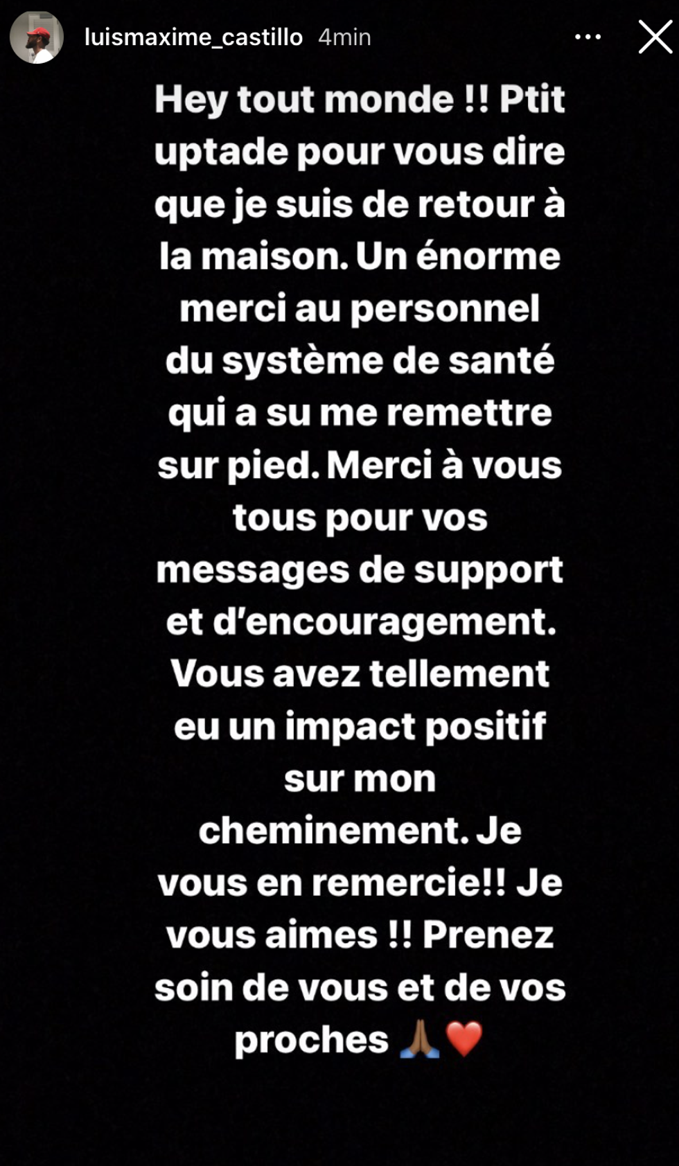 « Hey tout le monde !! Ptit update pour vous dire que je suis de retour à la maison. Un énorme merci au personnel du système de santé qui a su me remettre sur pied. Merci à vous tous pour vos messages de support et d'encouragement. »