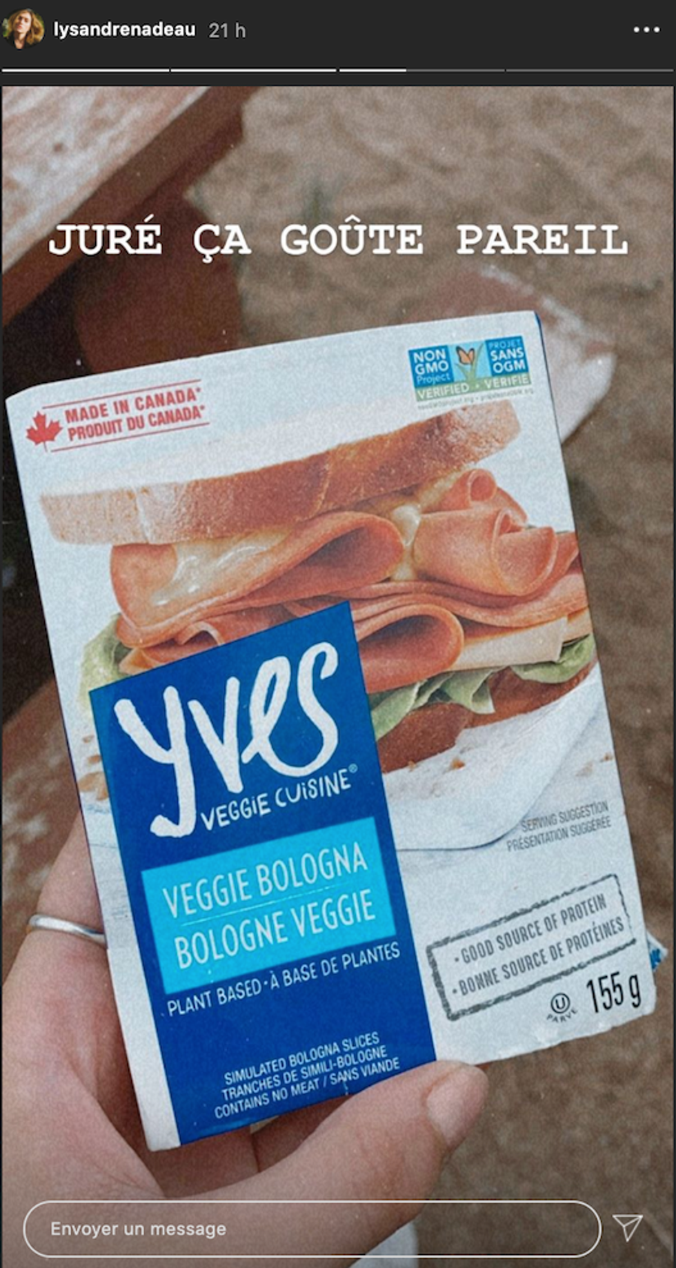 La même journée, on a aussi vu Lysandre Nadeau publier une photo de bologne végétarienne, une information intéressante puisque David est végane et la youtubeuse ne semble pas l'être si on se fie à ses vidéos en ligne.