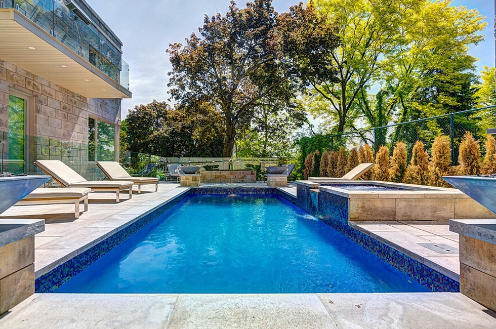 Une piscine avec des murs en plâtre vénitien, un bar en marbre et un foyer au gaz décore le jardin. Le troisième étage de la maison possède également un spa sur la terrasse.