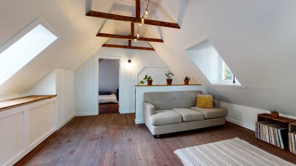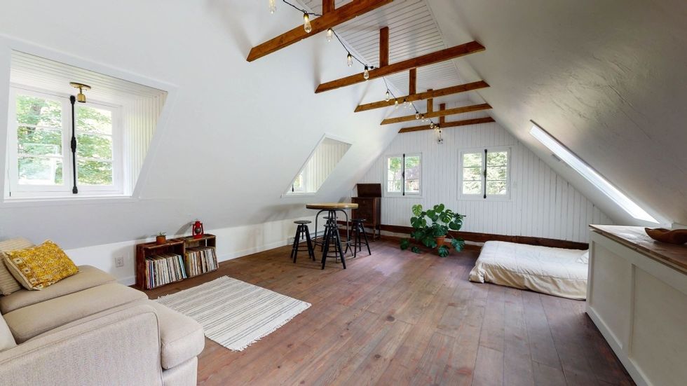À l'étage, on retrouve une petite salle familiale qui peut aussi servir de chambre d'amis avec plusieurs grandes fenêtres et la forme du toit.