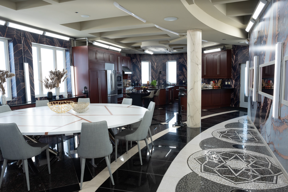 Les accents en marbre et doré sont aussi à l'honneur dans la cuisine et la salle à manger.