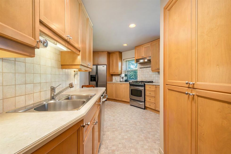 Le salon et la salle à manger sont à aires ouvertes et donnent directement sur le jardin, qui comprend une piscine et de l'espace pour accueillir plusieurs invités.