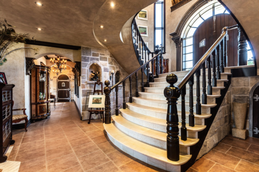 En entrant, un grand escalier prend place dans la décoration de style médiévale frappante. Planchers de céramiques, lustres aux plafonds, et de massives portes de bois donnent du cachet à la demeure.