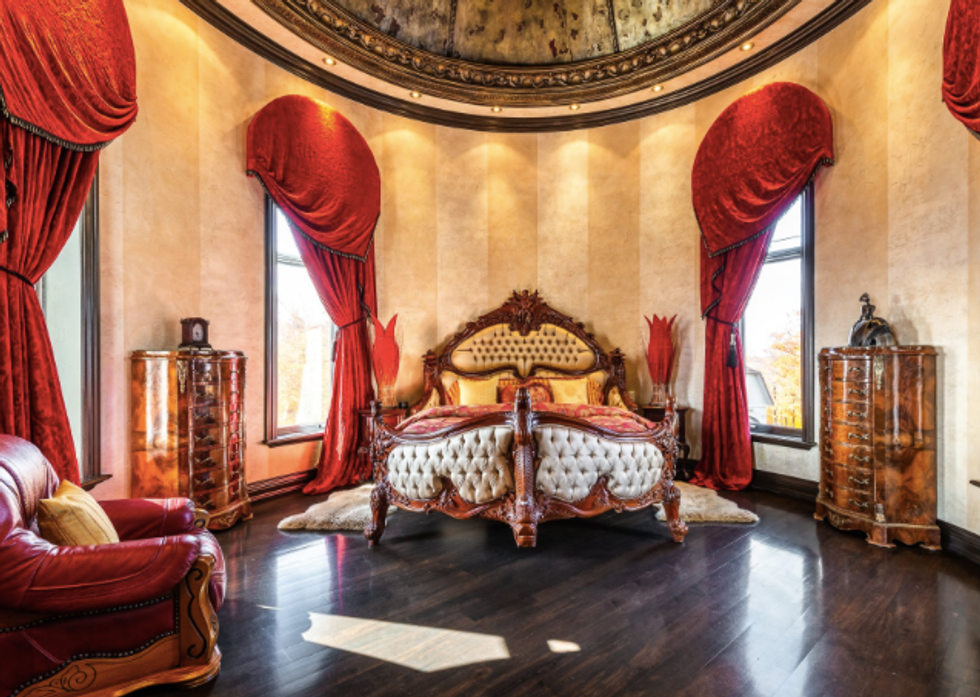 La chambre principale semble sortir tout droit du château de Versailles avec ses grands rideaux rouges.