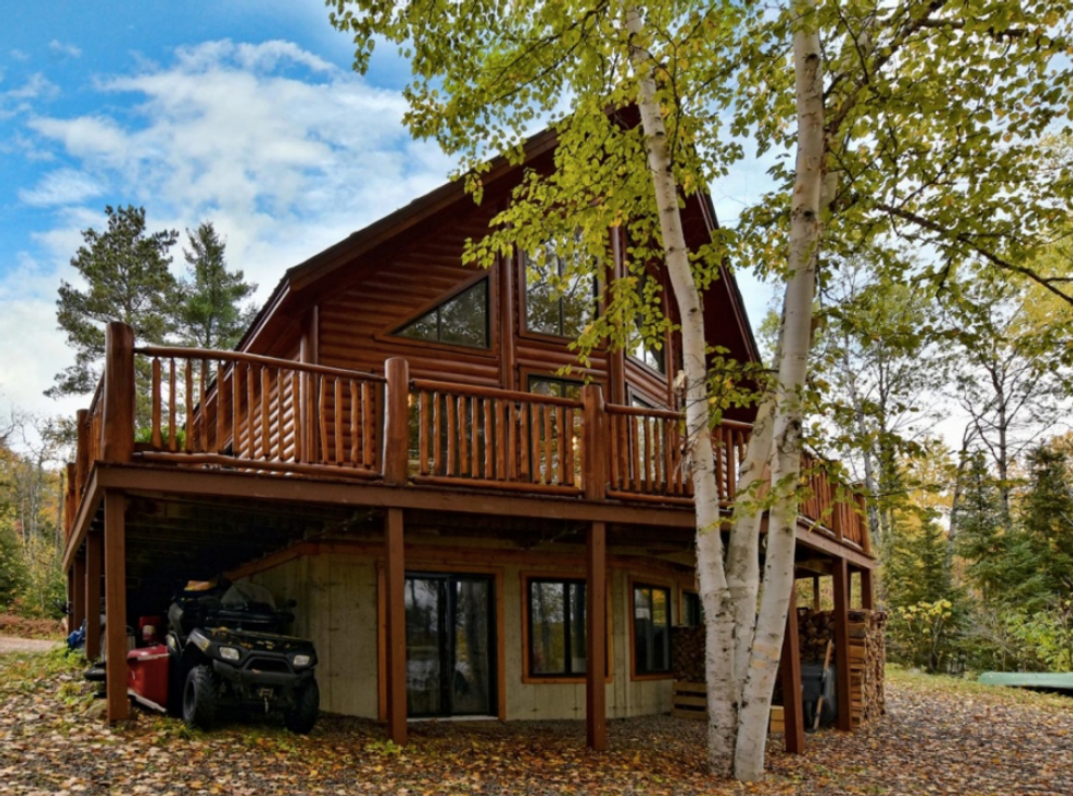 Ce gros chalet en bois rond possède un accès au lac à la Truite, un grand balcon avec une magnifique vue.