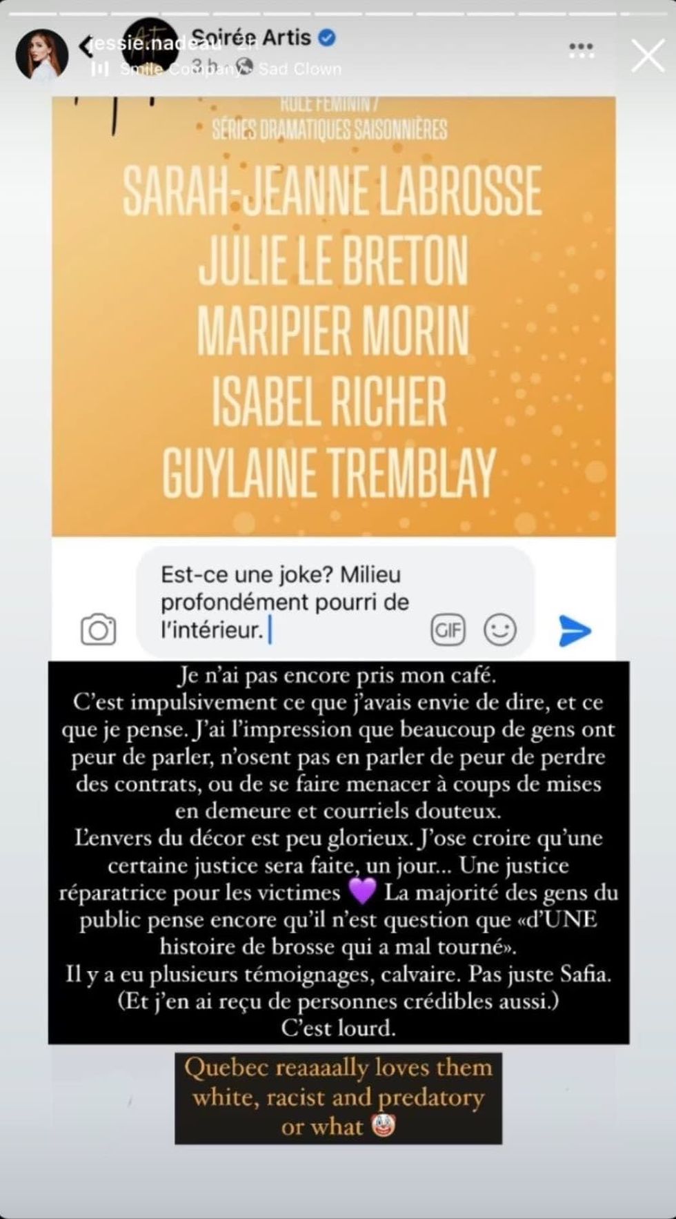 Jessie Nadeau s'est plutôt exprimée sur le milieu du vedettariat au Québec dont elle considère que « l'envers du décor est peu glorieux ».