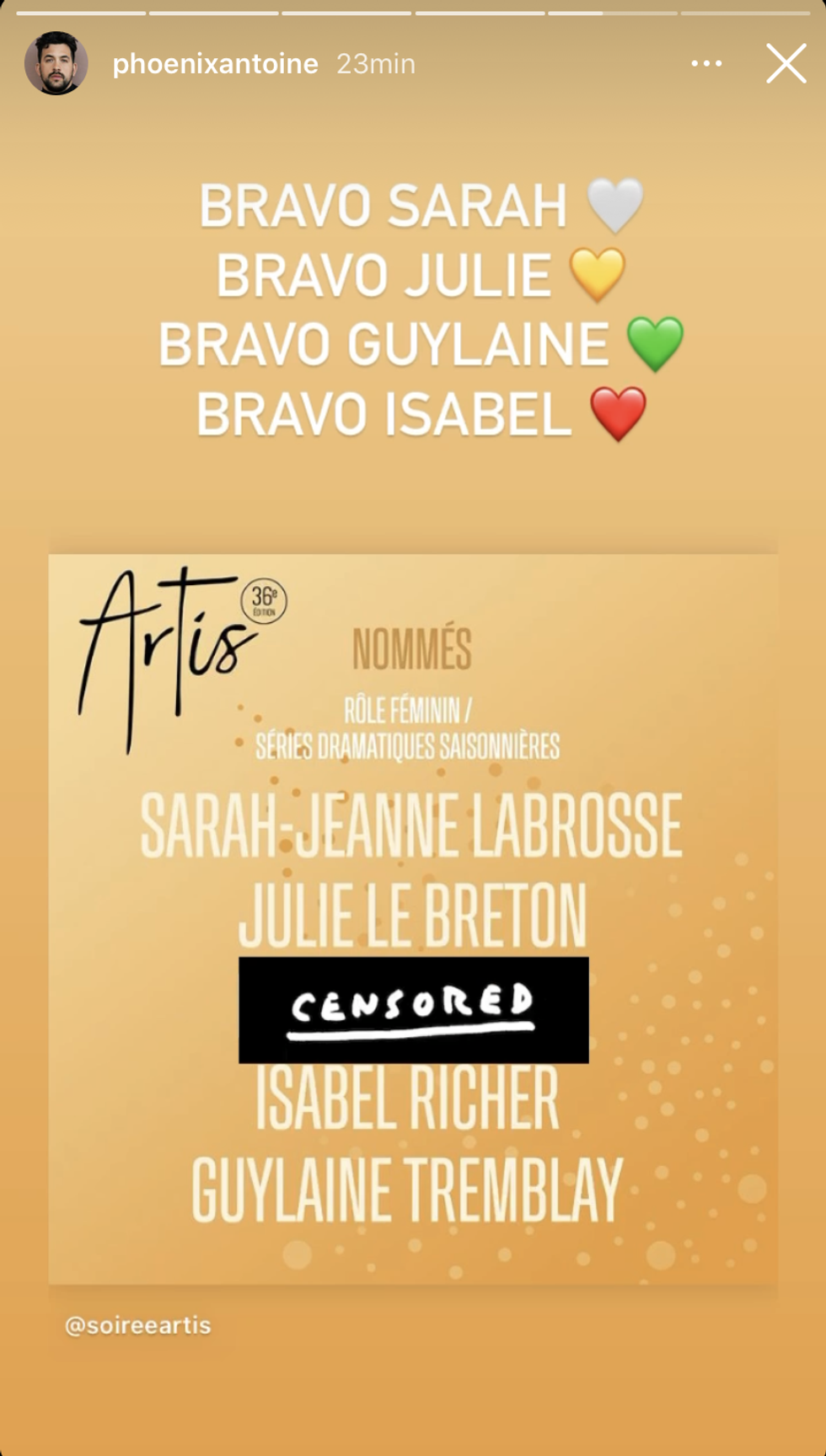 Après Arnaud Soly et Rosalie Vaillancourt, le comédien Félix-Antoine Tremblay a aussi choisi de cacher le nom de Maripier tout en félicitant les autres nommées.