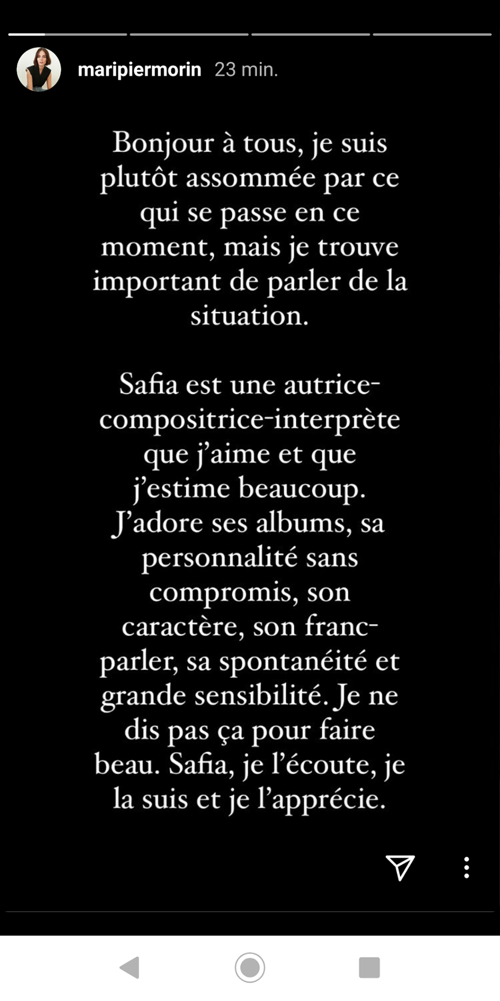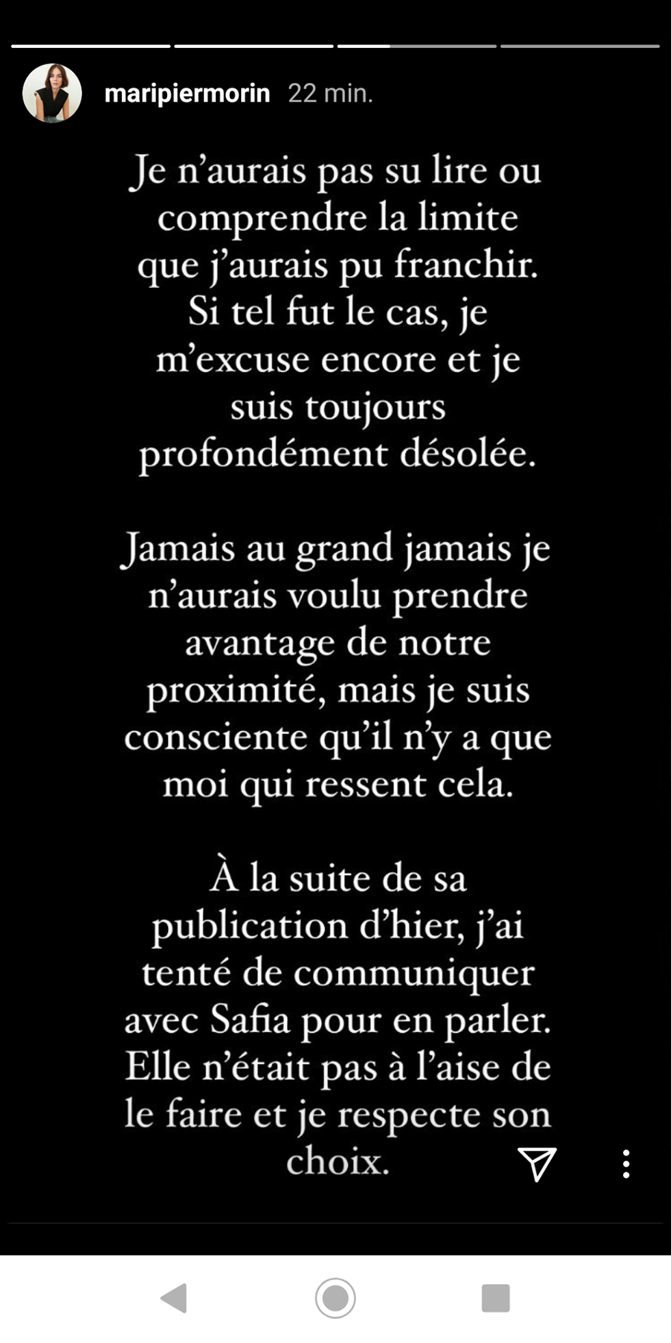 Maripier « n'aurait pas su lire ou comprendre la limite » qu'elle aurait pu franchir. Elle s'excuse de nouveau en soulignant qu'elle est profondément désolée et qu'elle n'a jamais voulu abuser de sa proximité avec Safia.
