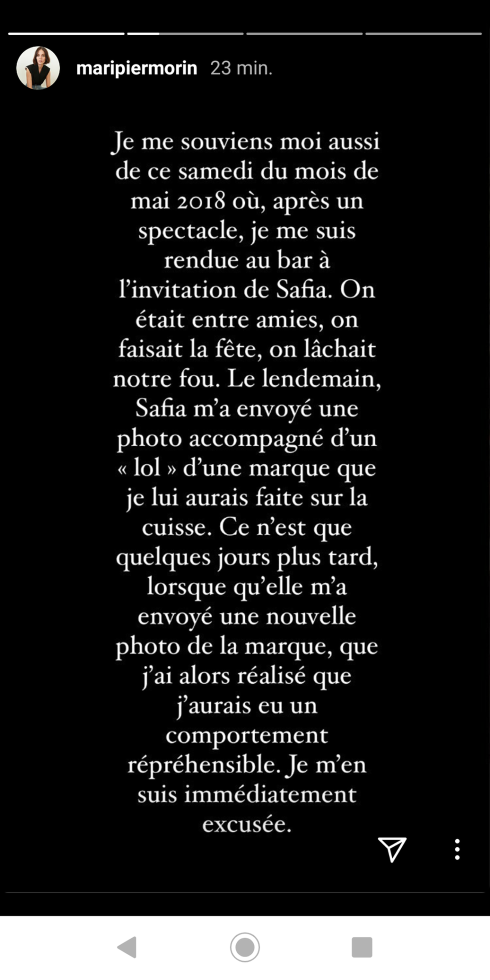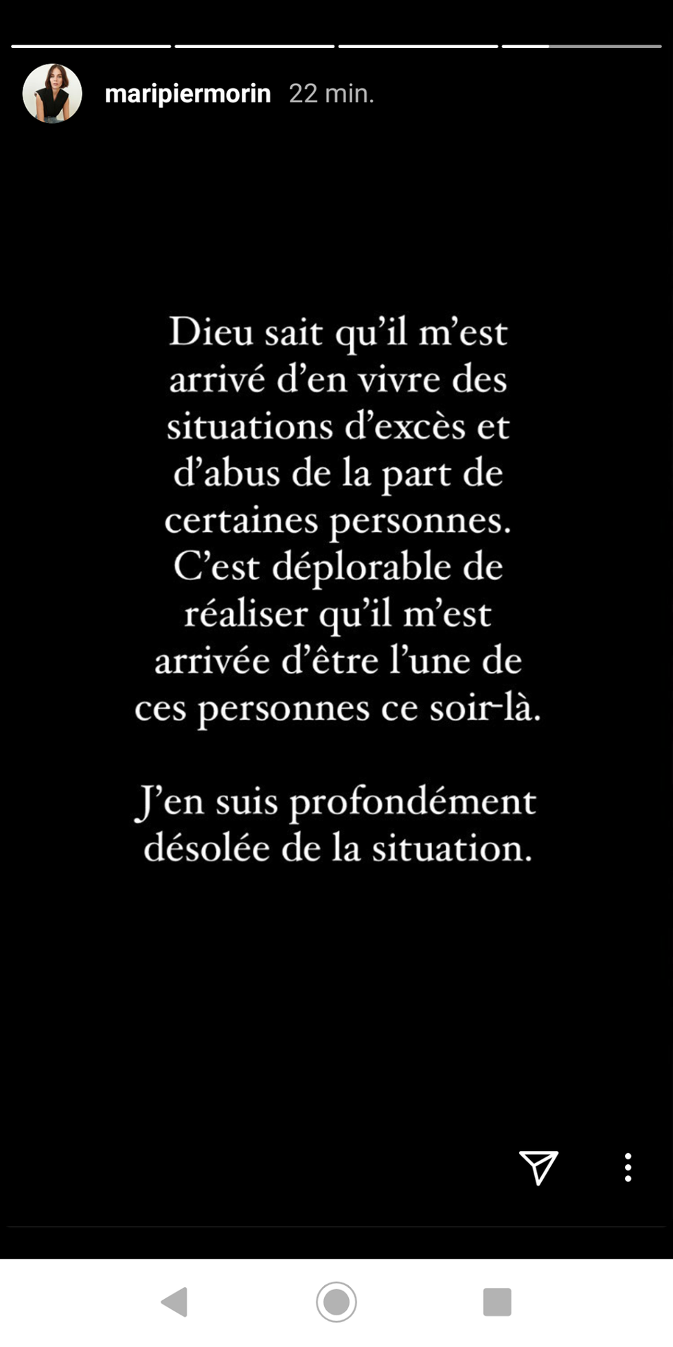 Maripier termine ses excuses en soulignant qu'elle a également vécu « des situations d'excès ou d'abus », et qu'elle trouve déplorable d'avoir été l'une de ces personnes cette soirée-là.