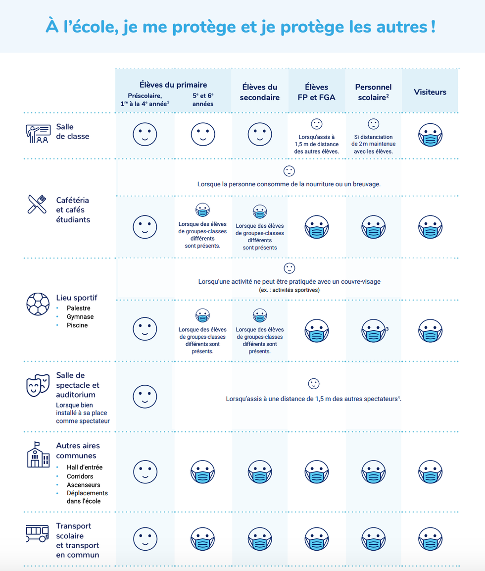 Ce tableau résume clairement quand les élèves du Québec devront porter le masque à l'école