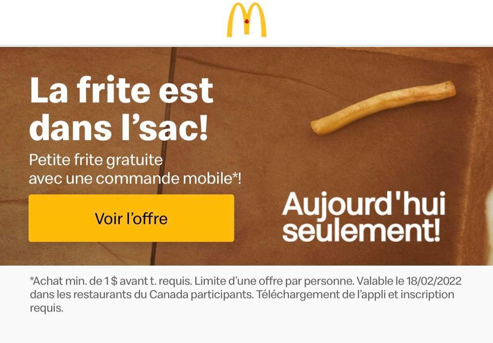 Pendant une journée seulement, avec un achat minimum de 1 $ sur l'application mobile de McDonald's, tu peux ajouter une petite frite à 0 $ à ton panier.