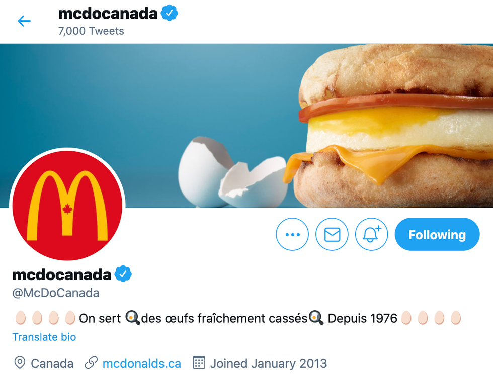 Depuis le 9 février, le compte Twitter canadien de la chaîne affiche son sandwich déjeuner en bannière et on peut lire dans la bio : « On sert 🍳 des oeufs fraîchement cassés 🍳Depuis 1976 ».