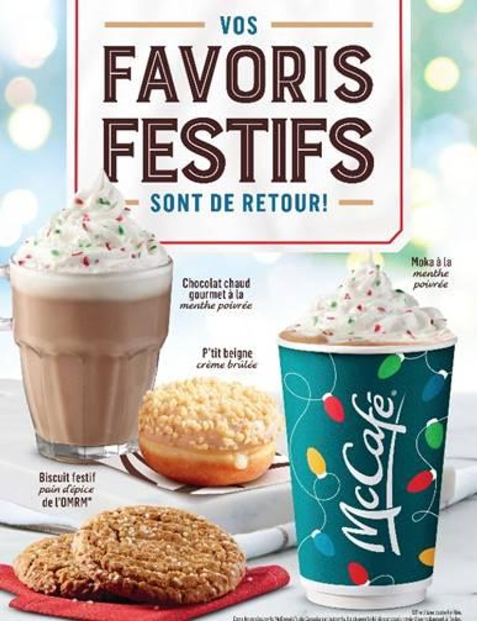 Cette année, le moka à la menthe poivrée garni de crème fouettée et d’éclats de cannes de bonbon et le chocolat chaud à la menthe poivrée sont les breuvages qui te réchaufferont le coeur. Si tu as une fringale, tu peux aussi goûter au biscuit pain d’épices ou au p'tit beigne à la crème brûlée.