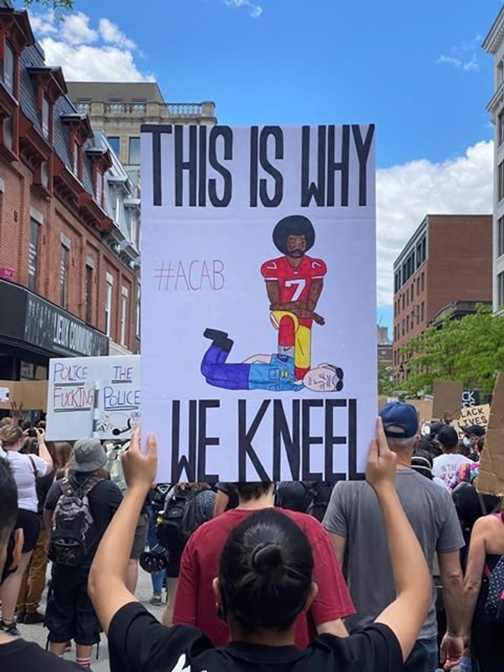Certains utilisent également le geste de Colin Kaepernick, joueur américain de football qui avait posé le genou par terre pour dénoncer le racisme le 1er septembre 2016 lors de l'hymne national d'avant-match de son ancienne équipe, les 49ers de San Francisco.