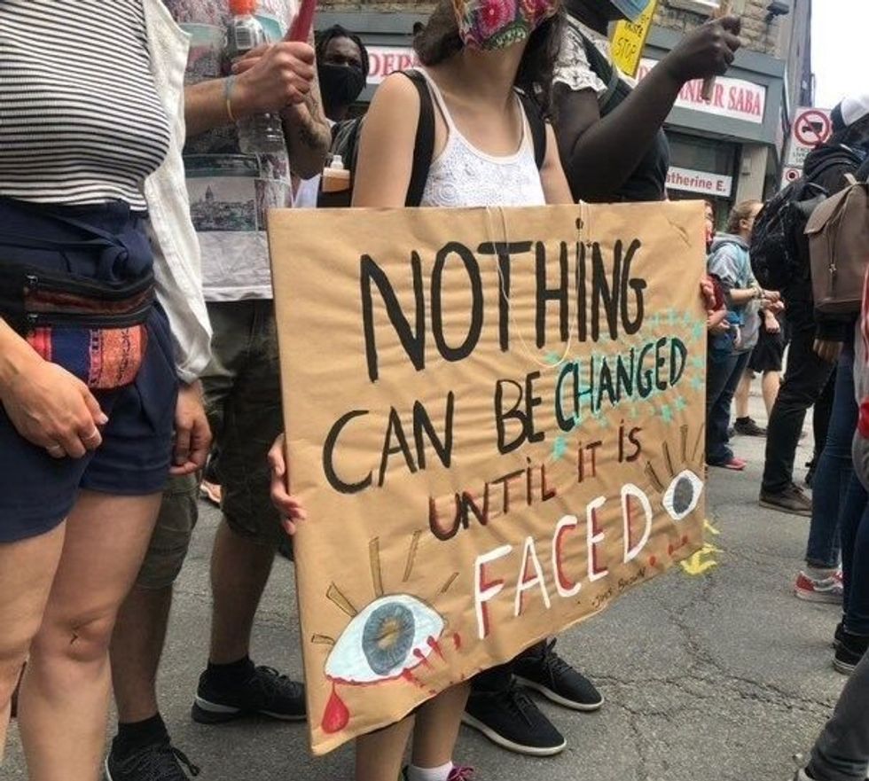 « Rien ne peut être changé avant d'y faire face », peut-on lire sur cette enseigne. (Traduction libre)