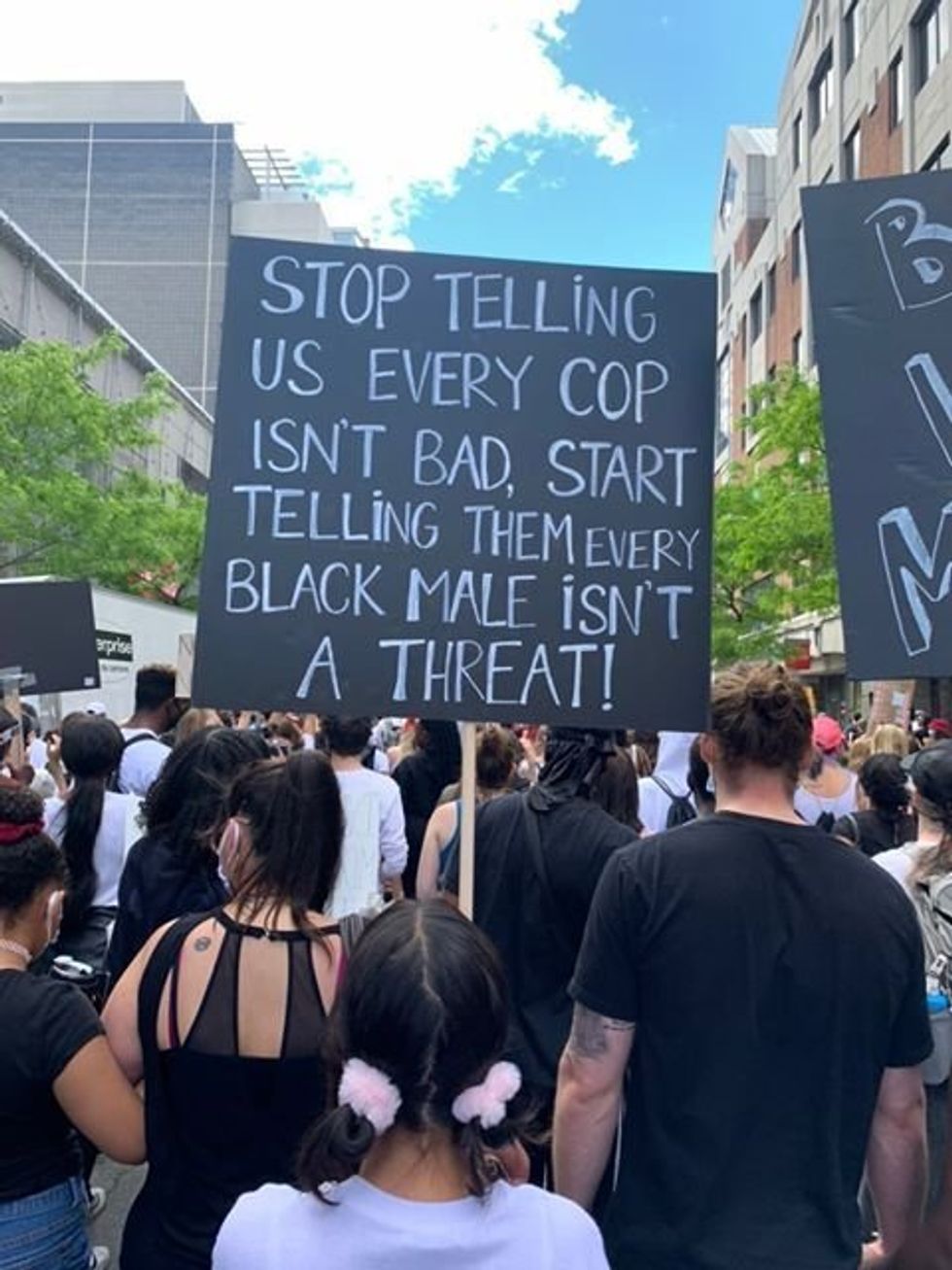 « Arrêtez de nous dire que ce ne sont pas tous les policiers qui sont mauvais, commencez à leur dire que ce ne sont pas tous les Noirs qui sont une menace », peut-on lire sur cette affiche. (Traduction libre)