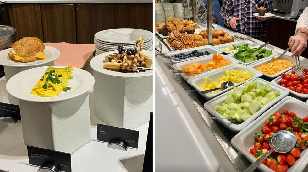 Comme mon vol était prévu le matin, j’ai pu profiter d’un buffet bien garni, comprenant des fruits frais, des viennoiseries, une section de repas chauds et viandes, ainsi qu’un espace dédié au café, thés et jus. Il y avait même un bar à yogourt et bagels.
