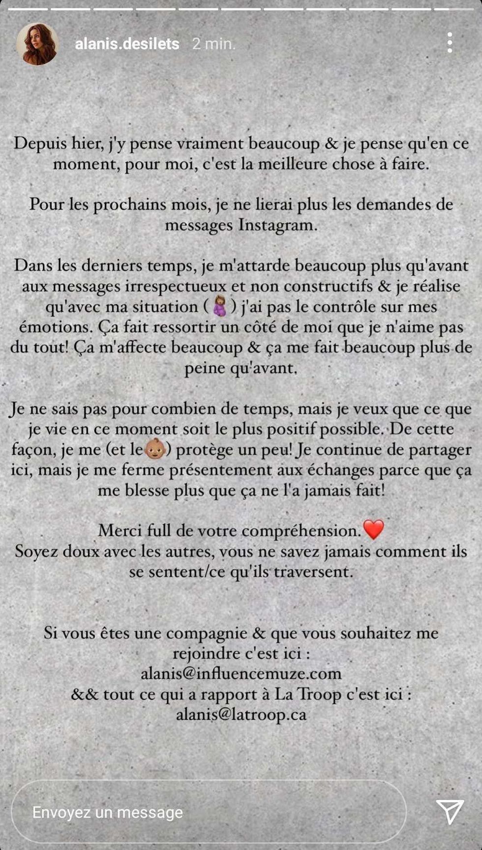 Alanis a donc pris cette décision afin de se protéger elle-même et son petit garçon. La future maman précise qu'elle continuera tout de même de publier du contenu sur sa plateforme. Elle conclut en conseillant à ses abonnés d'être « doux avec les autres. »